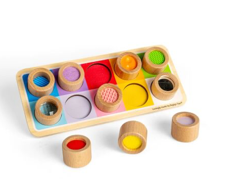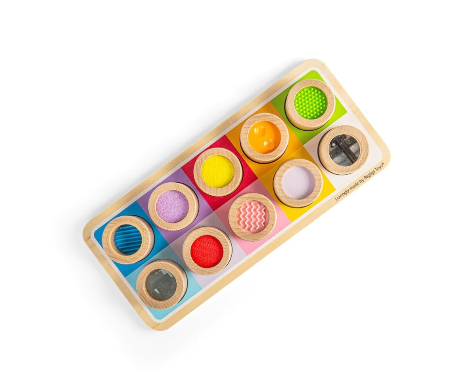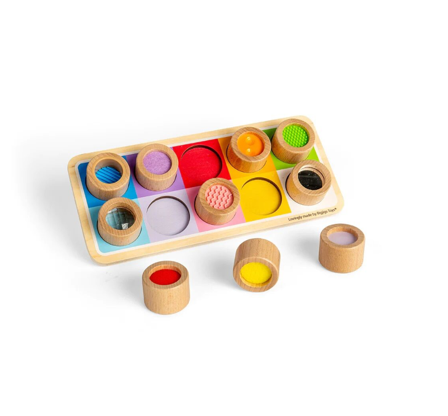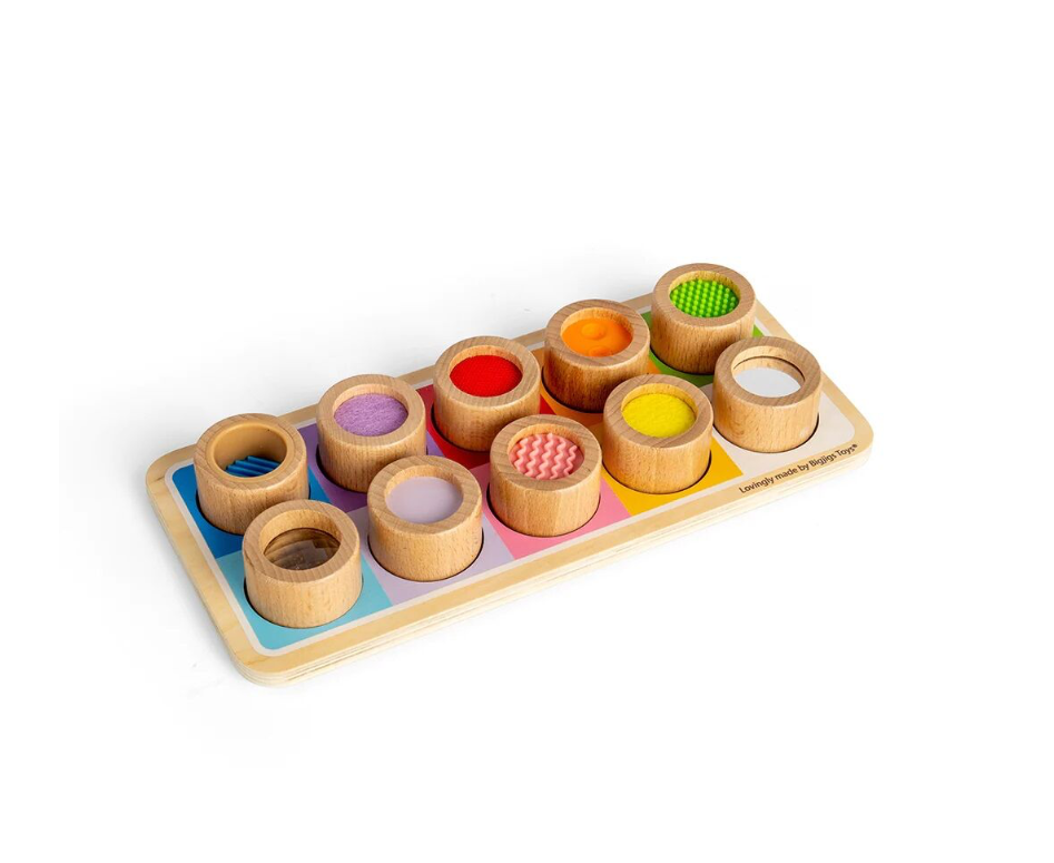 Děti s touto duhovou senzorickou deskou objeví nové vzory a textury. Hračka se skládá z dřevěné desky s barevnými otvory a deseti válcovitých dílků, na kterých najdete např. vroubkovaný silikon, plsť, zrcadlo… Tato senzorická deska děti naučí rozdíly mezi různými texturami, mezi velikostmi a barvami. Děti si při hře procvičí zručnost a motoriku.