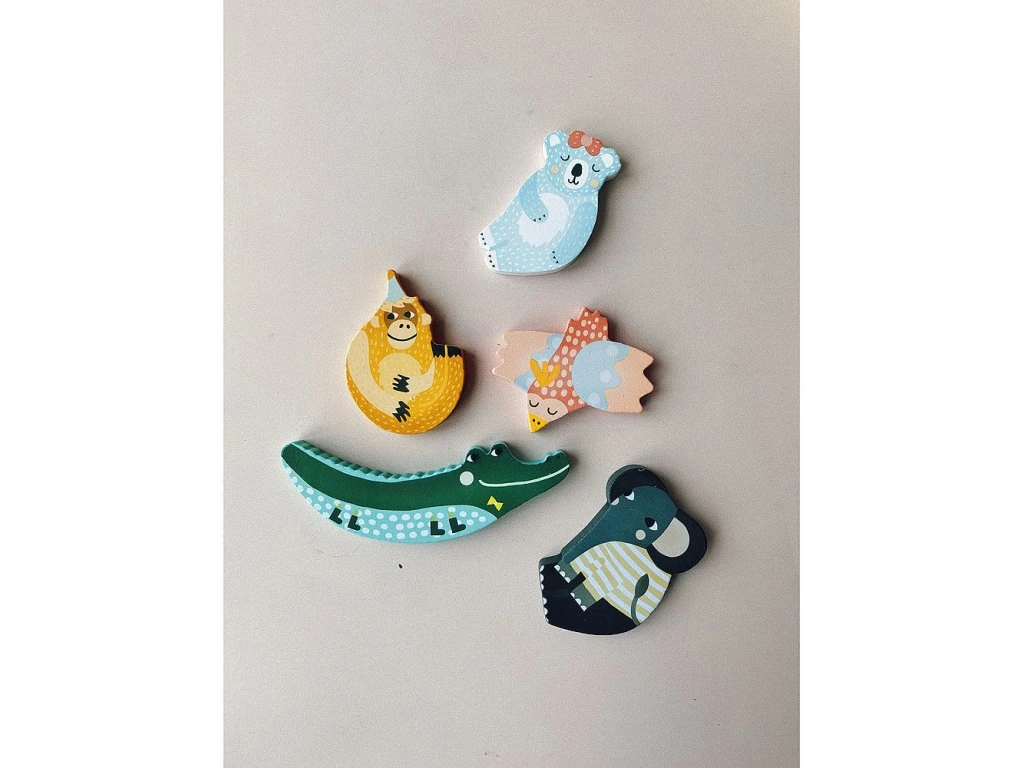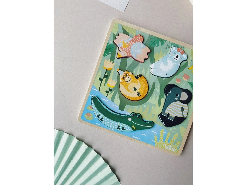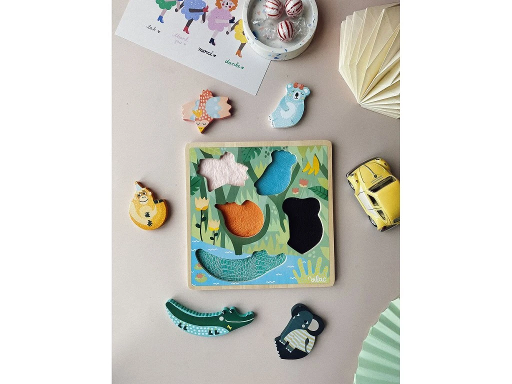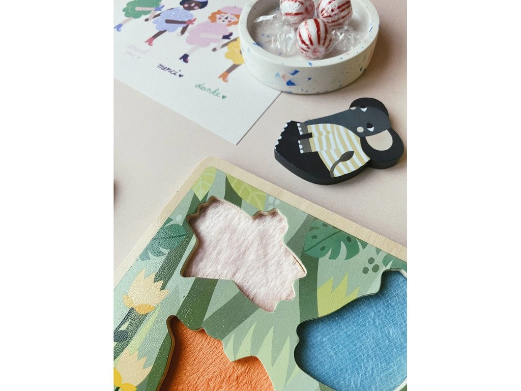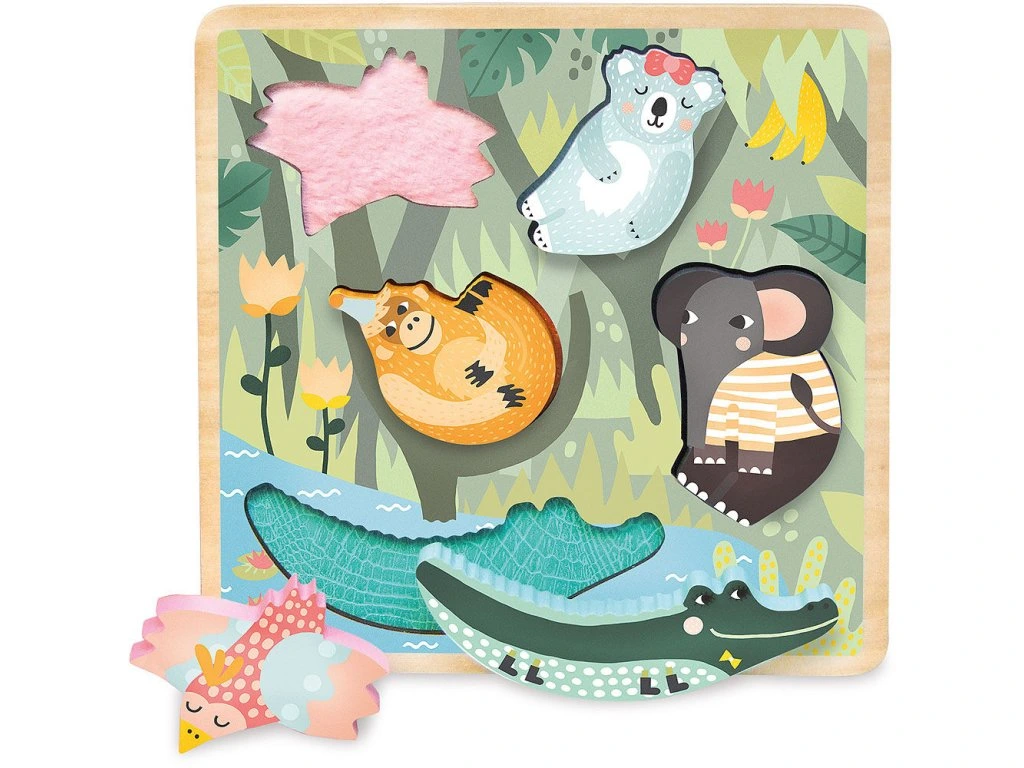 Krásná senzorická dřevěná vkládací hra pro děti od 18 měsíců. Když děti z rámečku vyjmou dílek, objeví pod ním určitou látku, která má pod každým dílkem zvířete jinou texturu. Ilustrováno Michelle Carlslund.