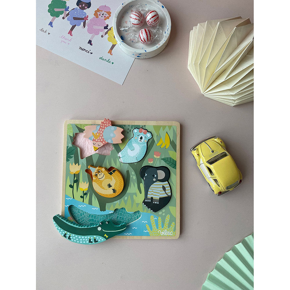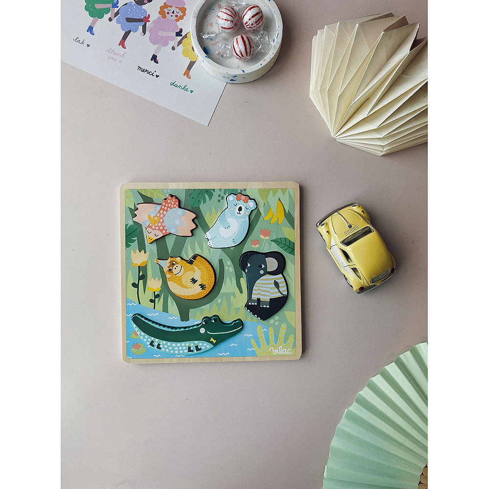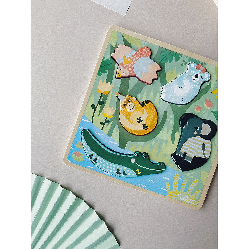 Pěkná senzorická vkládačka pro děti, plně dřevěná. Když děti z rámečku vyjmou dílek, objeví pod ním určitou látku, která má pod každým dílkem zvířete jinou texturu. Ilustrováno Michelle Carlslund.