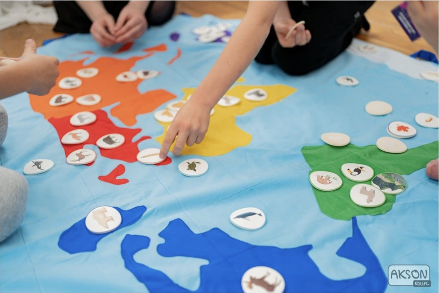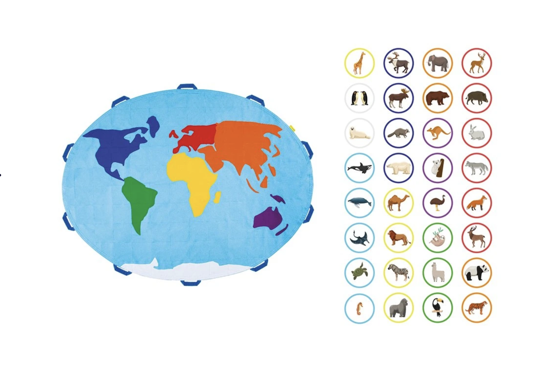 Vzdělávací padák znázorňuje zeměkouli se sedmi kontinenty - každý v jiné barvě. Na celý povrch mapy (oceány a země) můžete s dětmi připevnit 30 prvků se zvířátky na suchý zip.