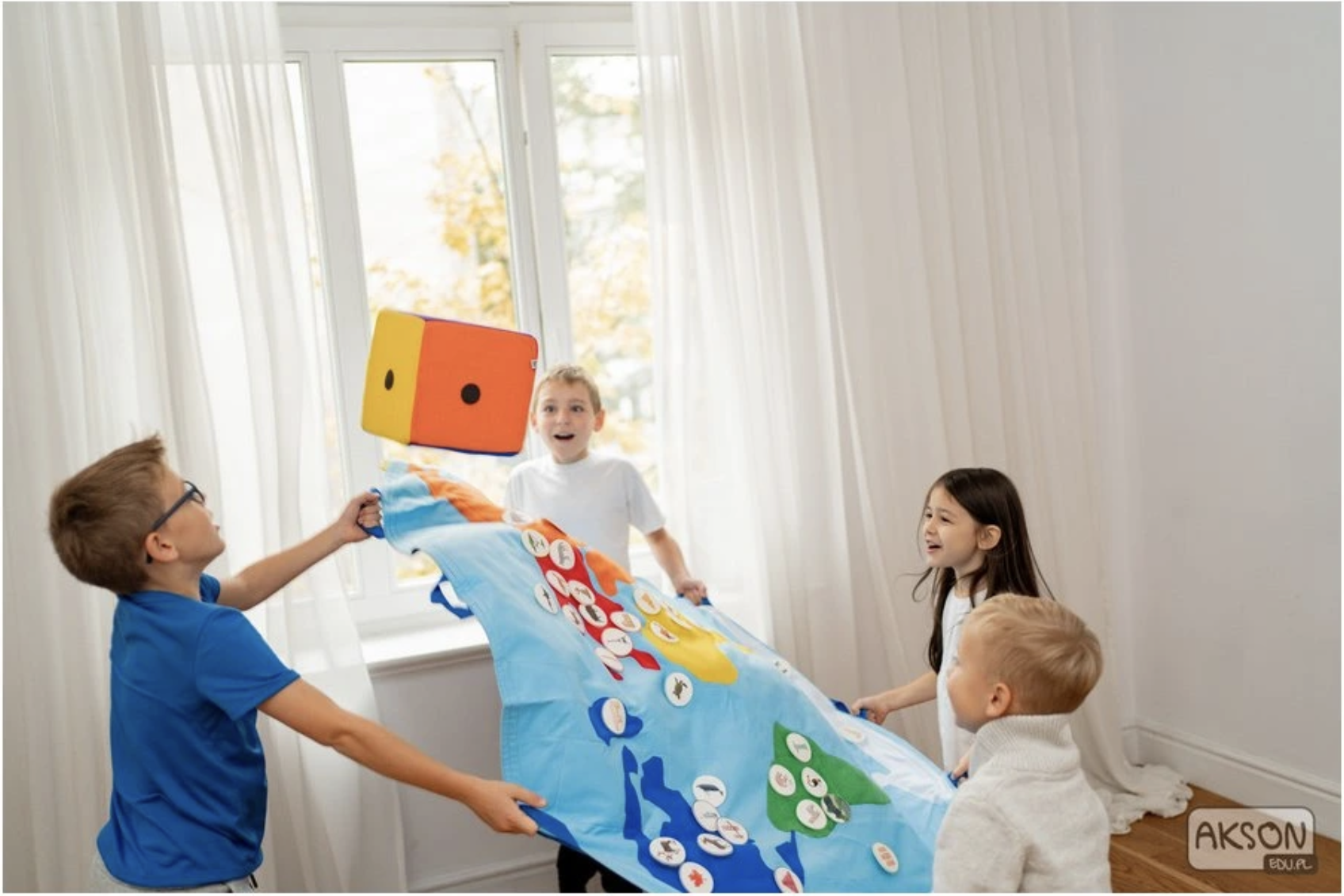 Barvy rámečků prvků odpovídají barvám jednotlivých kontinentů, díky čemuž je učení hrou ještě příjemnější! Padák je ušitý z odolného materiálu a má 12 vyztužených úchytů, které rozšiřují nabídku her a možností použití (podložku můžete rozložit na zem nebo držet ve vzduchu).Vzdělávací padák v sobě ideálně spojuje zábavu a vzdělávání. Navíc dokonale podporuje rozvoj koordinace oko-ruka, procvičuje reflexy a vnímavost a zároveň umožňuje užít si radost z pohybu a být součástí skupiny. Barevná mapa světa přitahuje pozornost, vzbuzuje zájem a zvědavost všech účastníků hry.