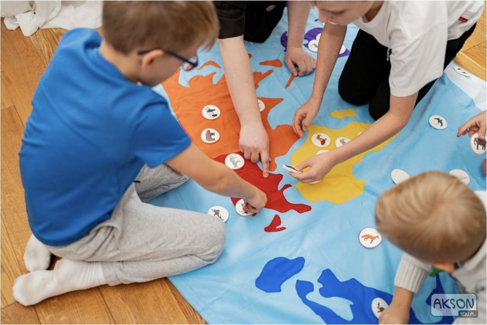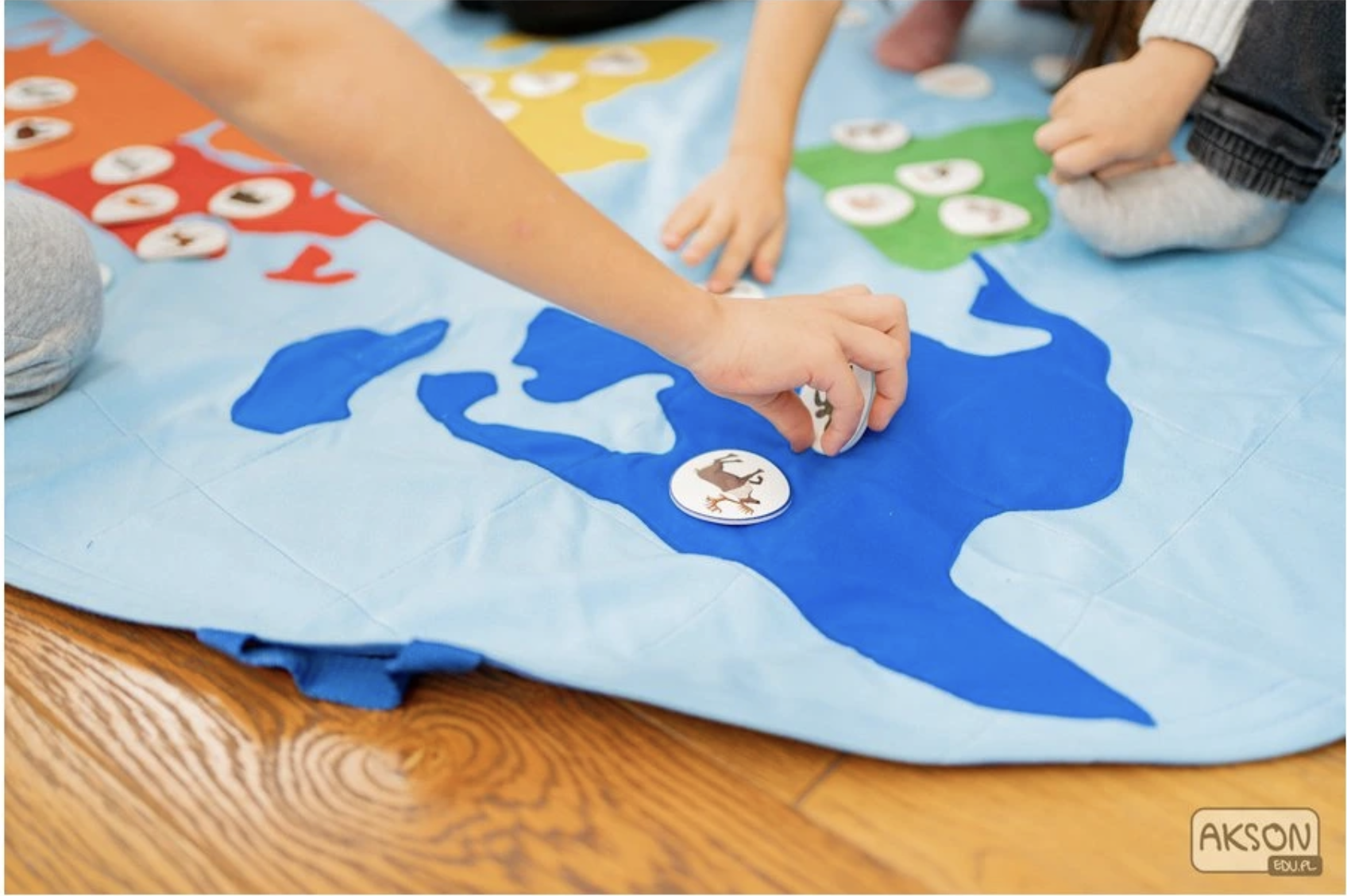Vzdělávací padák znázorňuje zeměkouli se sedmi kontinenty - každý v jiné barvě. Na celý povrch zeměkoule (oceány a země) můžete s dětmi připevnit 30 prvků se zvířátky na suchý zip (lze dokoupit).