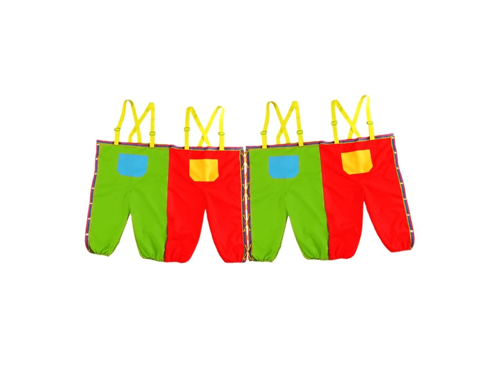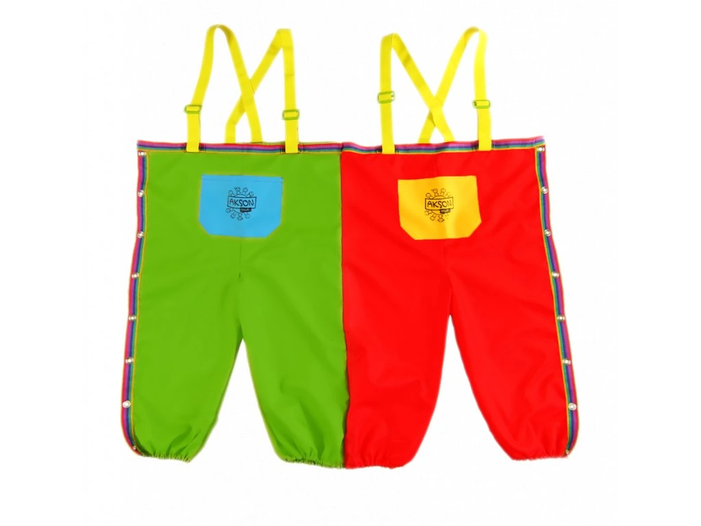 Originální dvojité kalhoty pro parádní zábavu i utužení vztahů mezi dětmi. Zdvojené kalhoty jsou k sobě trvale připojeny pevným a odolným švem. Díky pásce s očky k nim však můžete provázkem připevnit i další pár dvojitých kalhot. Kalhoty jsou vyrobeny z odolného nepromokavého materiálu a snadno se udržují v čistotě.