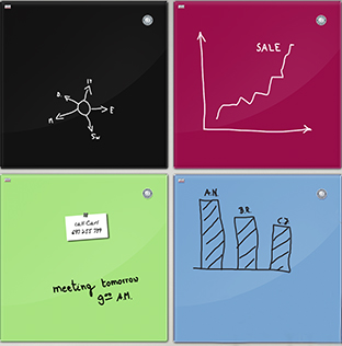Skleněné tabule mají zaoblené rohy, které je činí bezpečnější při používání. STÍRATELNÉ vlastnosti umožňují dělat si poznámky nebo malůvky, a zase je okamžitě změnit, kdykoliv budete potřebovat.