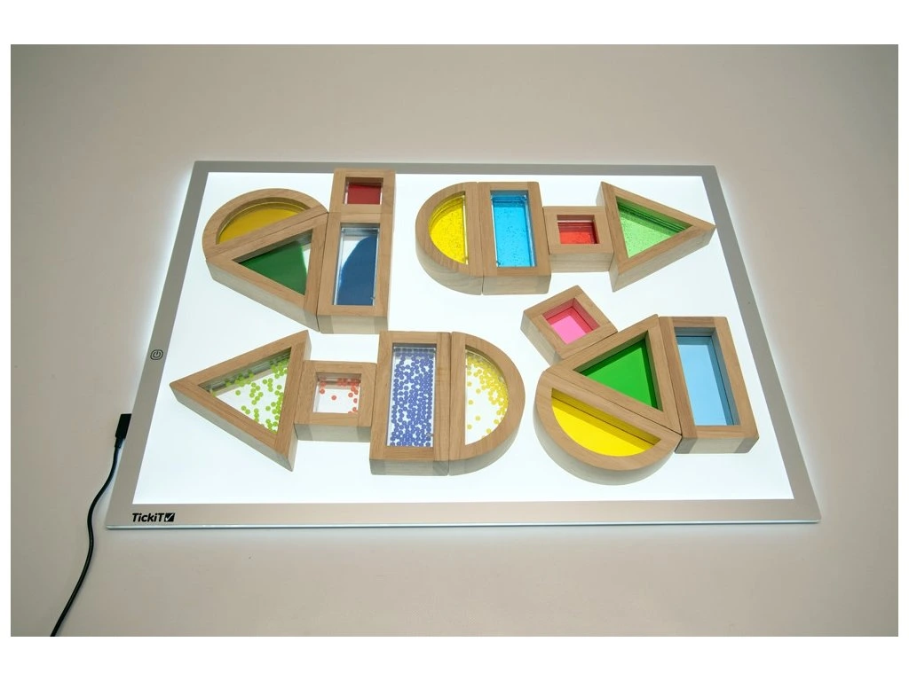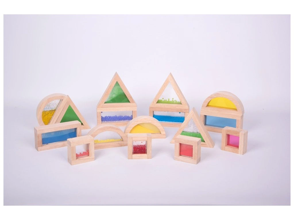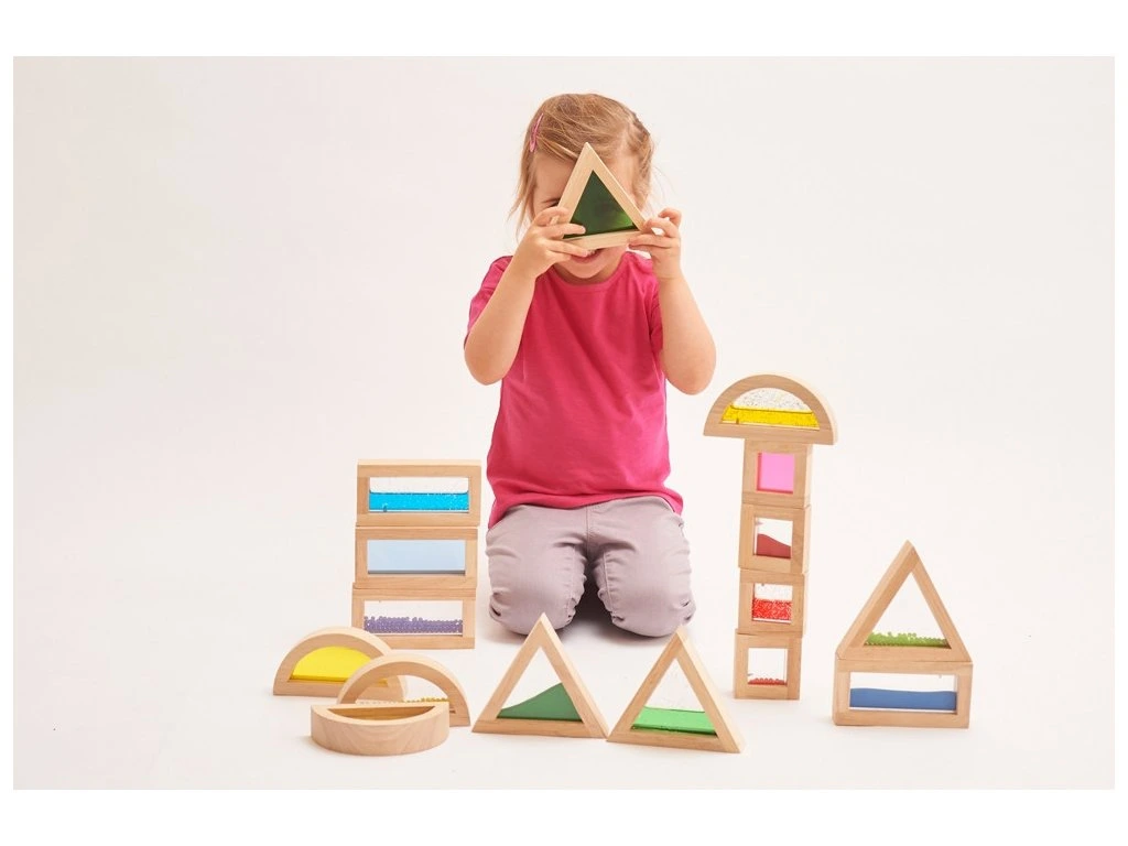 Tyto bloky vás i vaše děti budou prostě bavit! V každém dřevěném bloku se ukrývá jiný obsah – barevné korálky, písek, průhledný akryl nebo třpytivá tekutina. Využití a možnosti hry jsou opravdu nepřeberné. Můžete přes ně pozorovat svět, prosvěcovat je baterkou, stavět na sebe, pozorovat prolínání barev a světla...