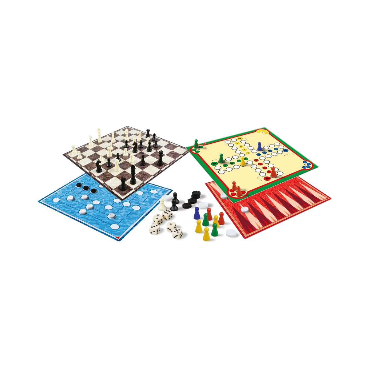 Balení obsahuje: 2 oboustranné herní plány (4 různé hrací plochy), 32 šachových figurek ve dvou barvách, 16 figurek ve čtyřech barvách, 30 dámových kamenů ve dvou barvách, 6 hracích kostek s oky, 1 návod.