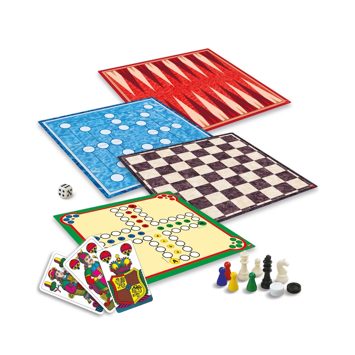 Balení obsahuje: 2 oboustranné herní plány, 32 šachových figurek ve dvou barvách, 16 figurek ve čtyřech barvách, 30 dámových kamenů ve dvou barvách, 6 hracích kostek s oky, 32 jednohlavých mariášových karet, 1 návod.