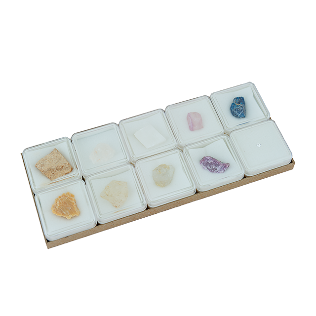 Pomůcka je tvořena kolekcí minerálů podle klasické Mohsovy stupnice tvrdosti (mastek, sůl kamenná, kalcit, fluorit, apatit, ortoklas, křemen, topaz, korund a diamant). Mimo diamantu jsou všechny minerály pravé. U každého minerálu je uveden název, chemické složení, soustava a lokalita výskytu. Minerály jsou uloženy v uzavíratelných krabičkách.