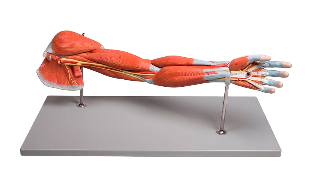 Model lidské horní končetiny zobrazuje povrchové a hluboké svaly, cévy, nervy a vazy. Model zobrazuje ruku, dolní a horní část paže a ramenní pletenec.