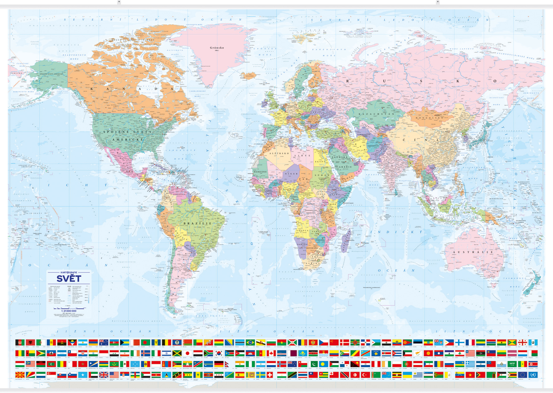 Ideální výzdoba každé kanceláře. Politické uspořádání států a závislých území celého světa, včetně všech hlavních a dalších významných měst. Mapa je doplněna vlajkami všech nezávislých států a rejstříkovými odkazy. Aktualizována byla v létě 2025.
