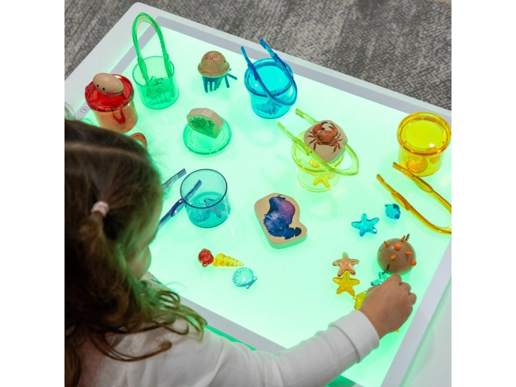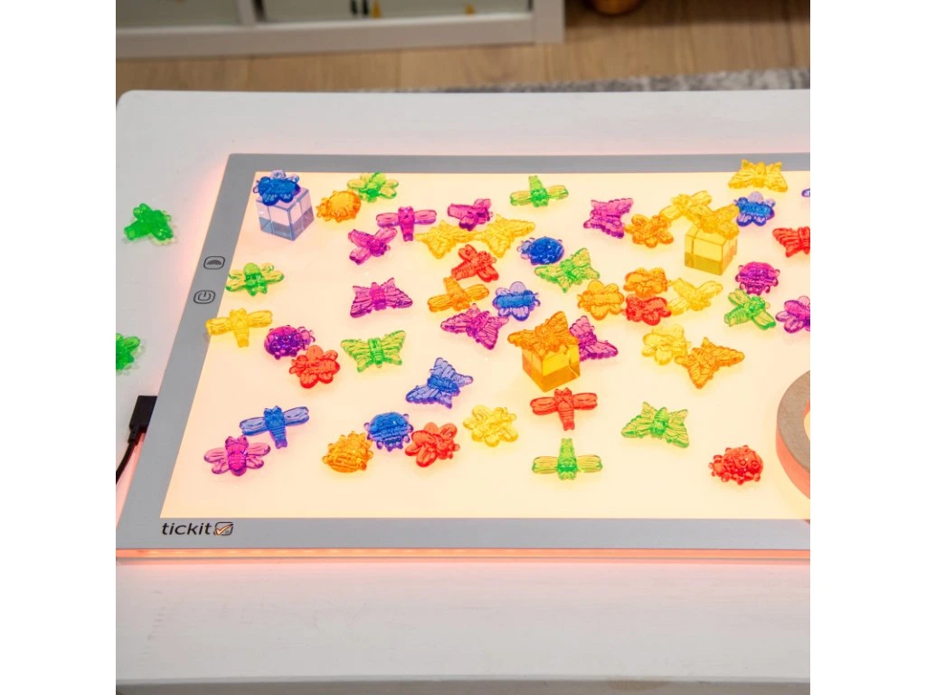 LED panel nabízí 8 zářivých barev včetně čistě bílé a 3 úrovně jasu, které si děti jednoduše nastaví jediným tlačítkem. Perfektně se hodí pro smyslové hry, zkoumání tvarů a barev, kreativní umělecké aktivity, práci se světelnými materiály i týmové projekty.
