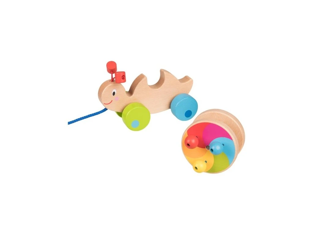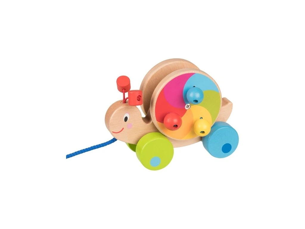 Malé děti milují tahací zvířátka na provázku. Duhový šneček je krásně výrazně barevný, má rozverná tykadýlka a navíc domeček, který lze odebrat a samostatně kutálet a chytat.