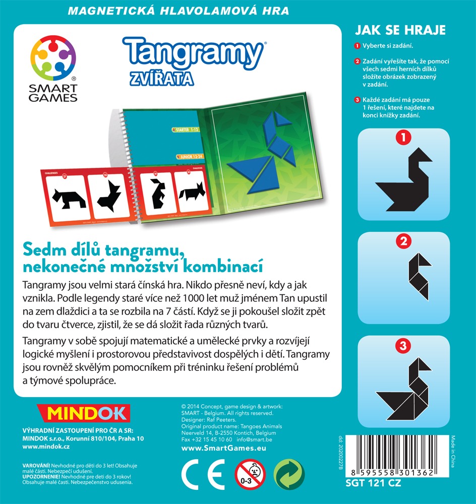 7 dílů tangramu, nekonečné množství kombinací. Tangramy jsou velmi stará čínská hra. Nikdo přesně neví, kdy a jak vznikla.