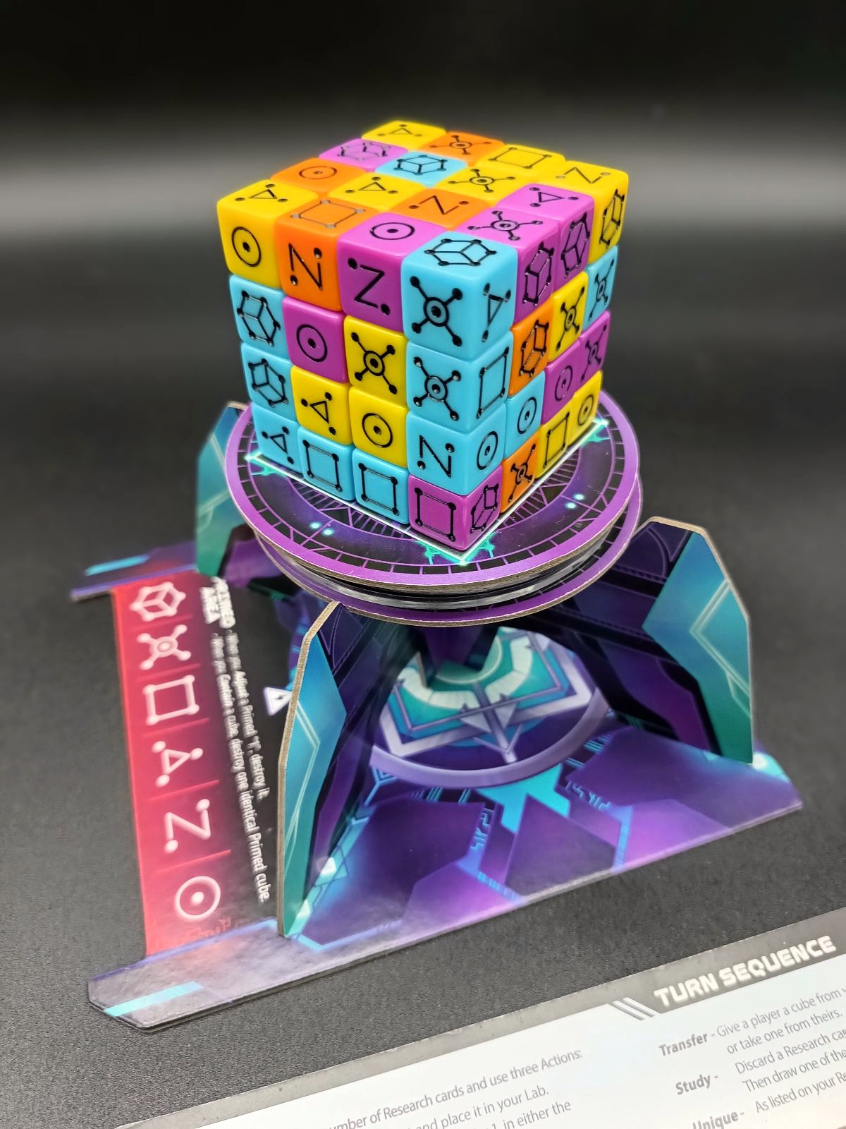 4 oboustranné základny Teseraktu, 1 točna, 2 desky podstavce, 1 návlek pro přípravu hry, 64 šestistěnných kostek (16 v každé ze čtyř barev), 41 karet výzkumu, 9 karet objevů, 11 karet výzkumníků, 1 panel Teseraktu, 1 panel stabilizace, 1 list trhlin, 1 žeton trhlin, 4 listy laboratoří (1 pro každého hráče), 4 žetony akcí, pravidla hry.