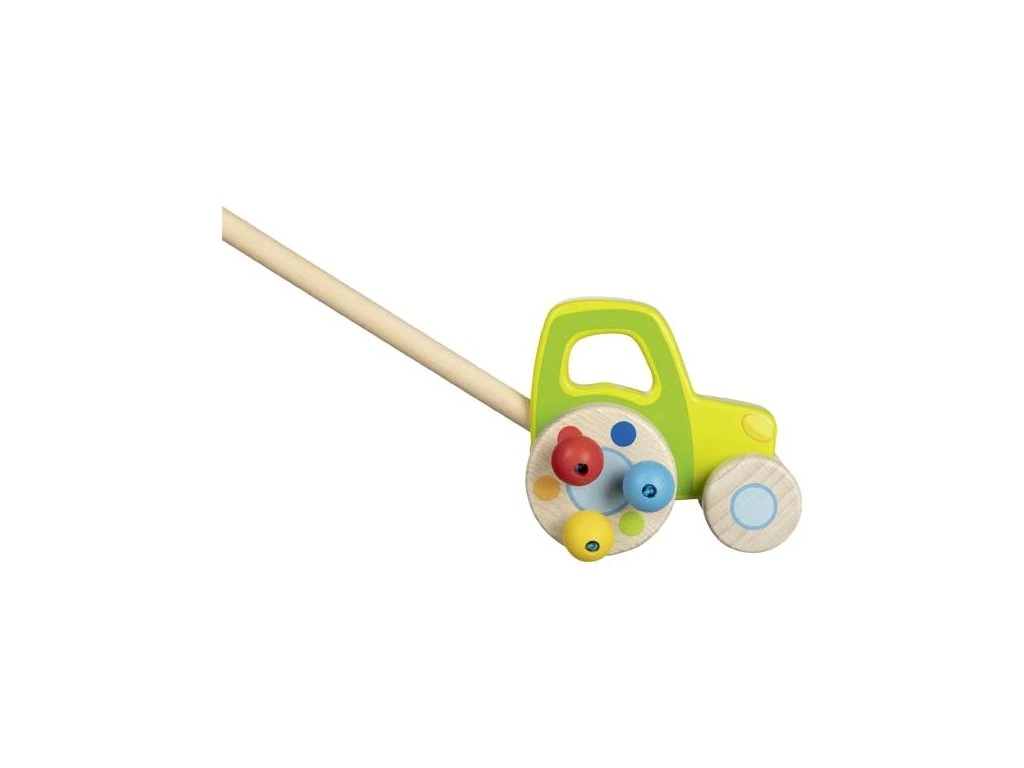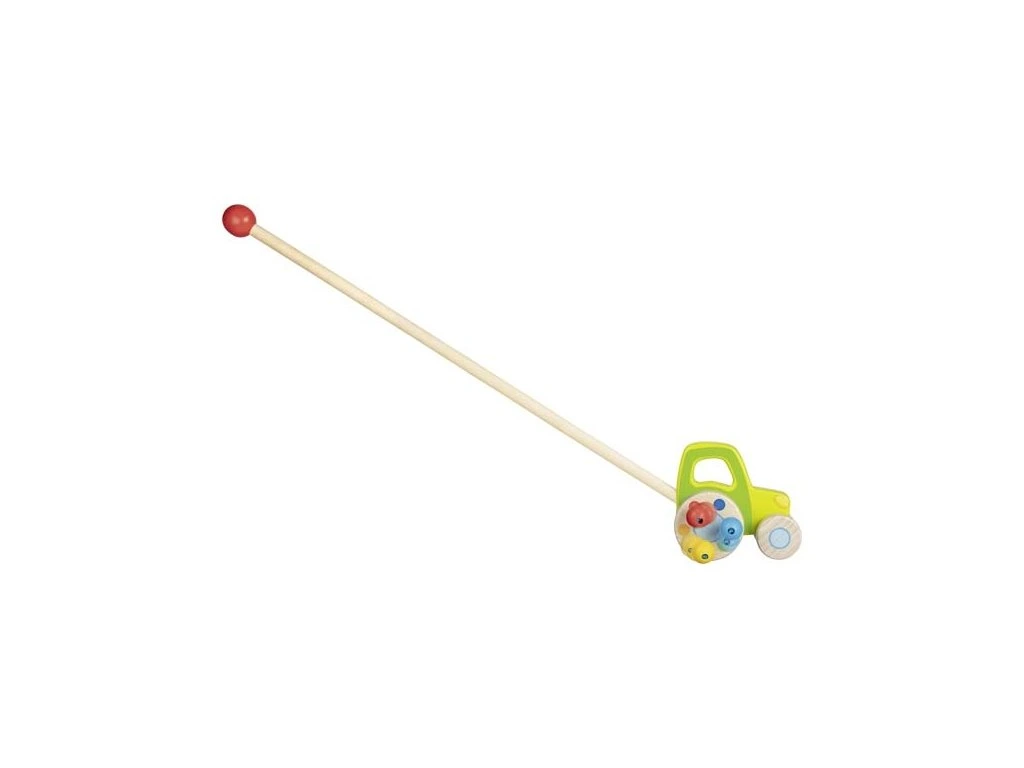 Zelený traktor na tyči zaujme děti, jakmile se stabilně udrží na nožkách. S traktorem se dobře vyjíždí na objevné cesty a navíc perličky na zadních kolech vydávají zvuky, což děti neuvěřitelně milují!