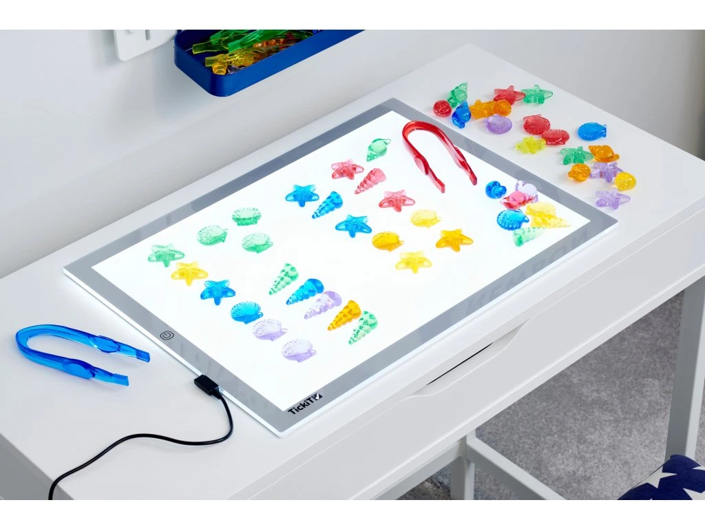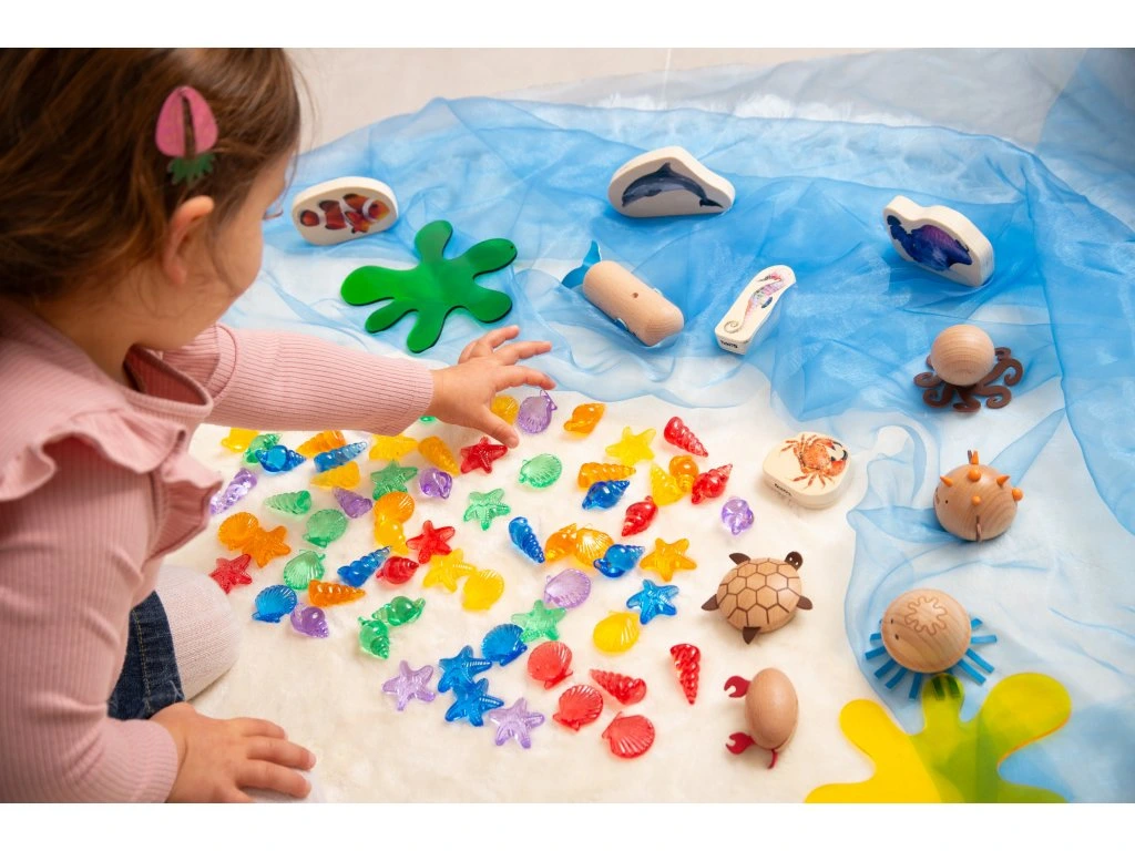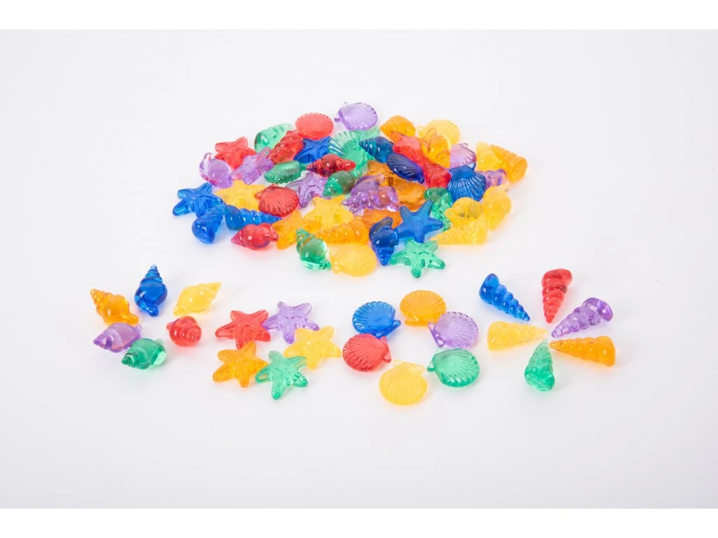 Transparentní barevné mušle a mořští tvorové pro počítání, třídění a vytváření různých obrazců. Díky průsvitným barvám jsou ideální pro použití na světelném LED panelu.
