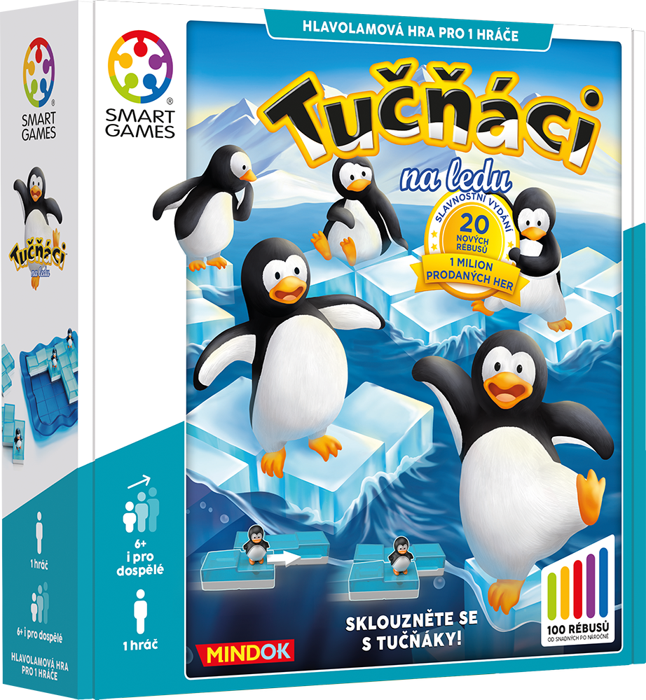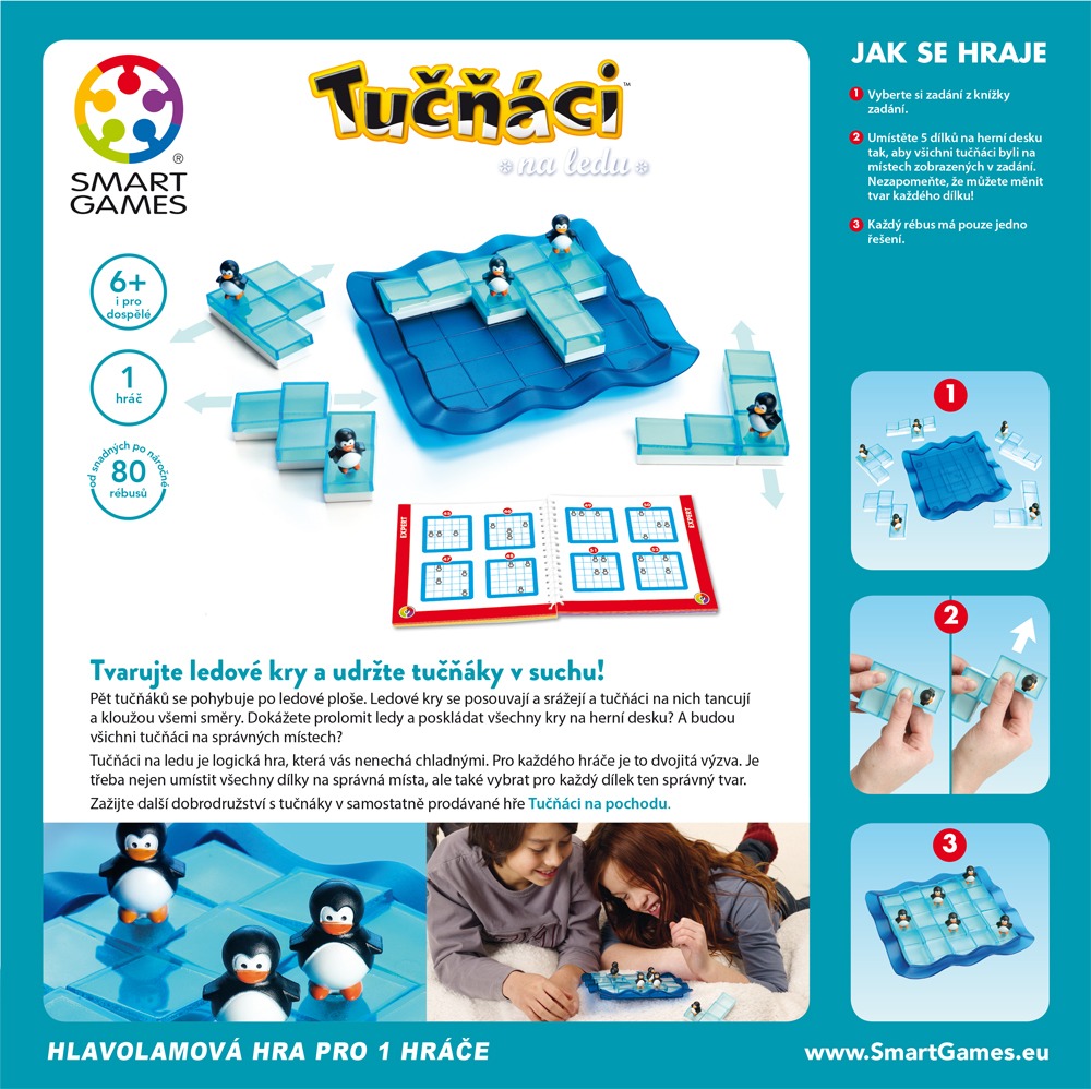 Pět tučňáků se pohybuje po ledové ploše. Ledové kry se posouvají a srážejí a tučňáci na nich tancují a kloužou všemi směry. Dokážete prolomit ledy a poskládat všechny kry na herní desku? A budou všichni tučňáci na správných místech? Tučňáci na ledu je logická hra, která vás nenechá chladnými. Pro každého hráče je to dvojitá výzva. Je třeba nejen umístit všechny dílky na správná místa, ale také vybrat pro každý dílek ten správný tvar.
