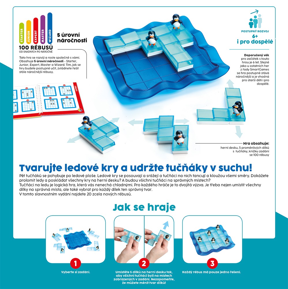 herní deska, 5 herních dílků s tučňáky, knížka zadání a řešení, česká a slovenská pravidla