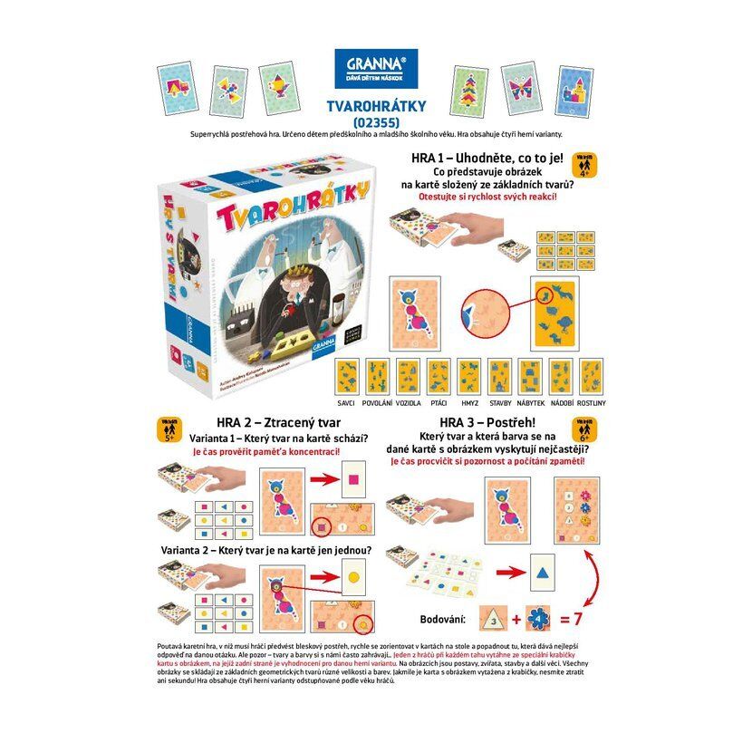 Jeden z hráčů vytáhne ze speciální krabičky kartu s obrázkem. Na obrázcích jsou postavy, zvířata, stavby a další věci. Všechny obrázky se skládají ze základních geometrických tvarů různé velikosti a barev. Jakmile je karta s obrázkem vytažena z krabičky, nesmíte ztratit ani sekundu! Hra obsahuje tři různé varianty odstupňované podle věku a pomůže zlepšit soustředění i rychlost reakcí celé rodiny.