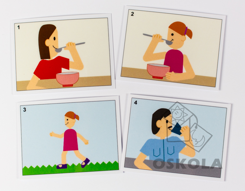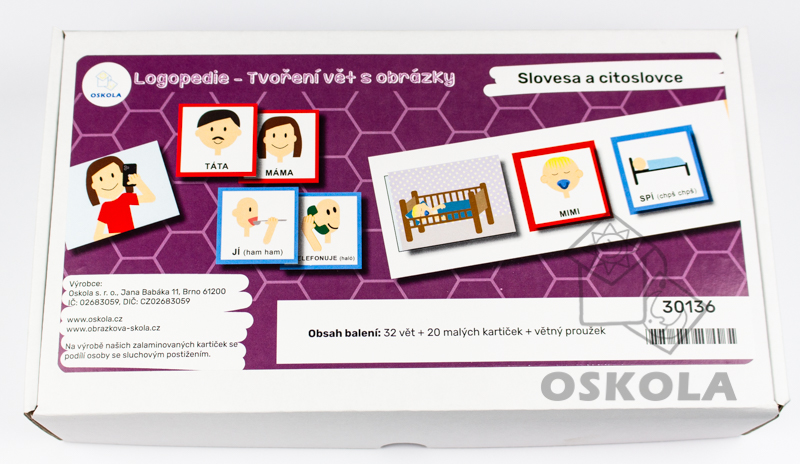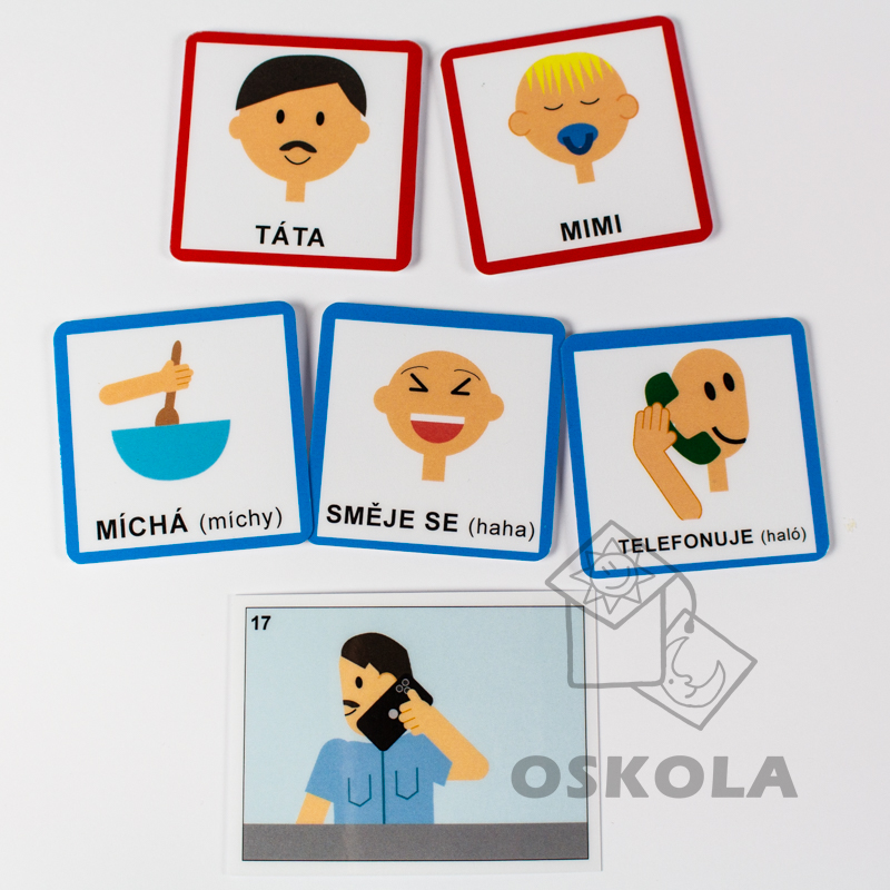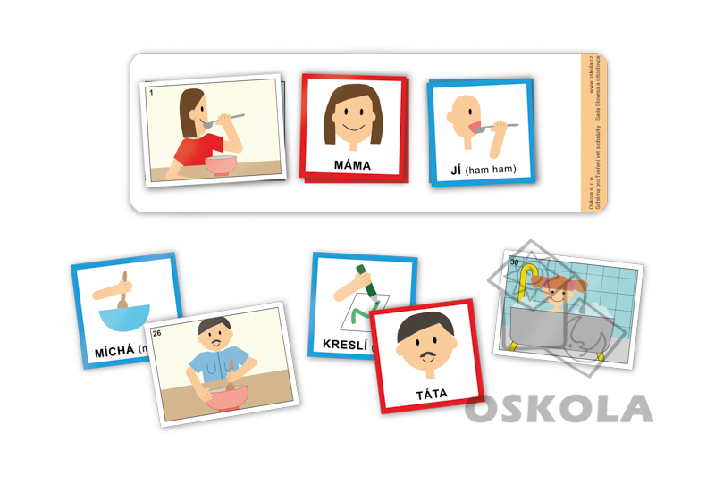 Sada obsahuje různé kartičky, které dětem umožňují sestavovat jednoduché věty z podstatných jmen, sloves a osob.