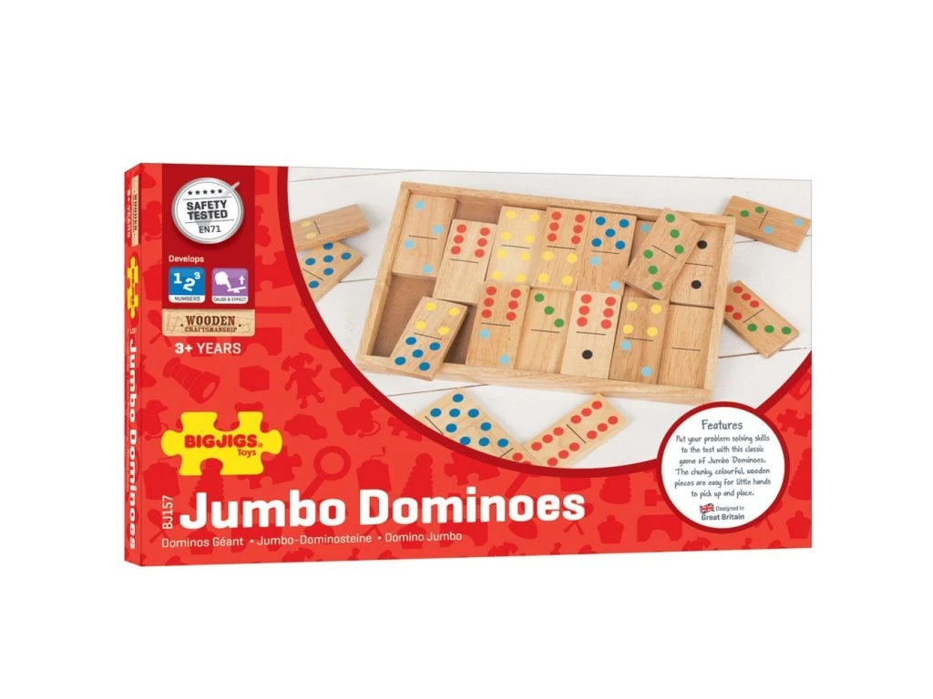 Tohle pestrobarevné dřevěné domino Jumbo, je perfektně dimenzováno pro malé ruce, kterým se tak dílky snadno zvedají a umisťují. Hra pomáhá rozvíjet obratnost, dovednosti v souhře a koncentraci. Hrací dílky lze po ukončení hry uložit do dřevěné krabice s posuvným víkem.