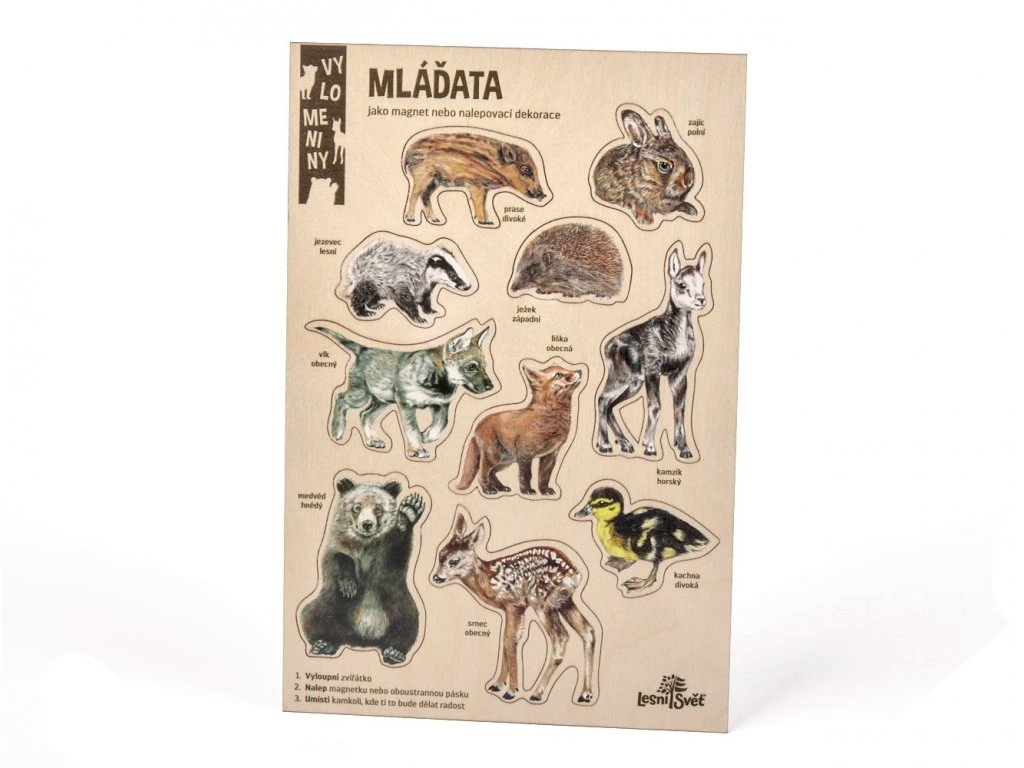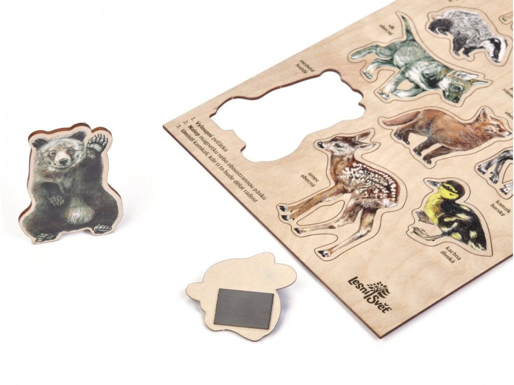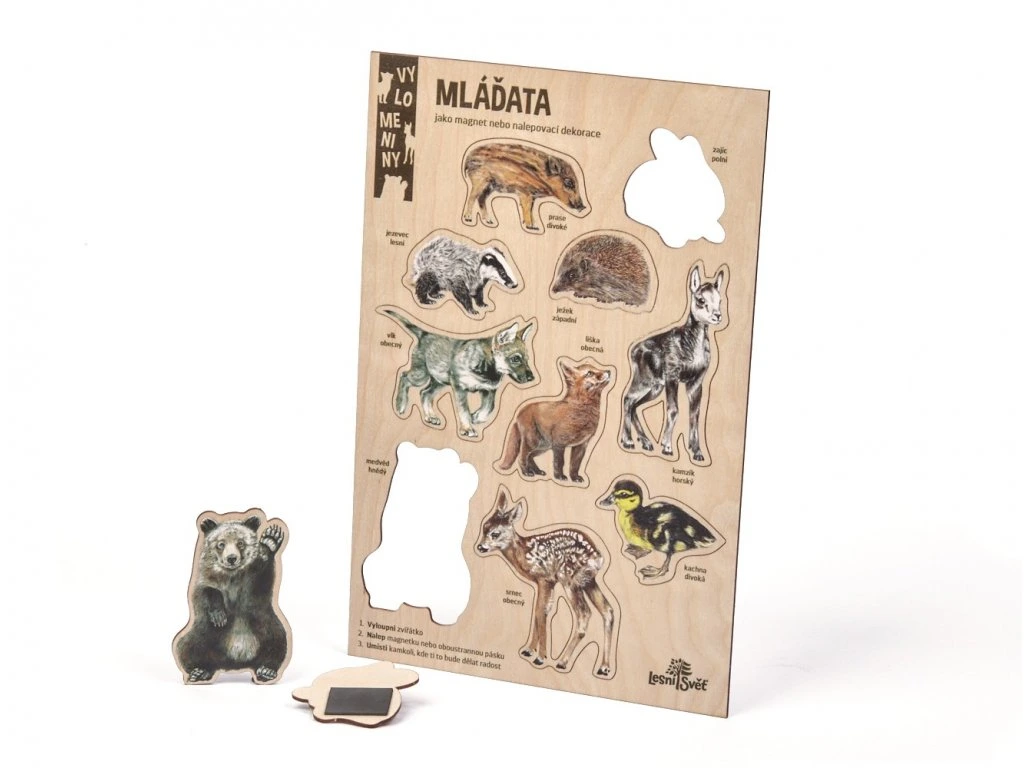 Sada 8 krásně ilustrovaných dřevěných mláďátek. Díky přiložené magnetické a lepící pásce lze zvířátka snadno připevnit na různé povrchy. Hračka podporuje kreativitu a jemnou motoriku dětí.