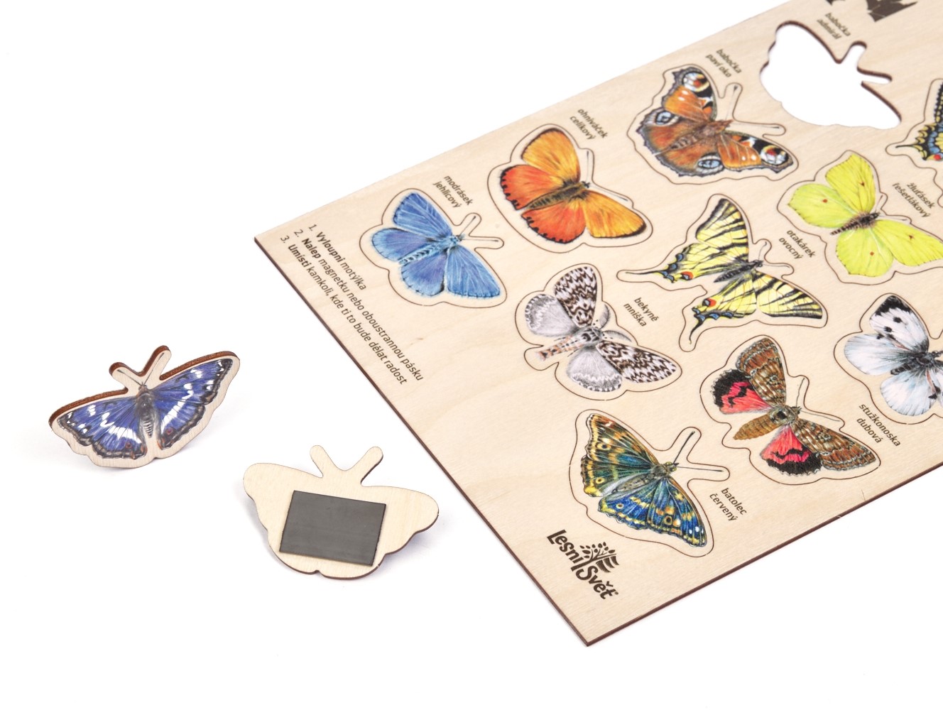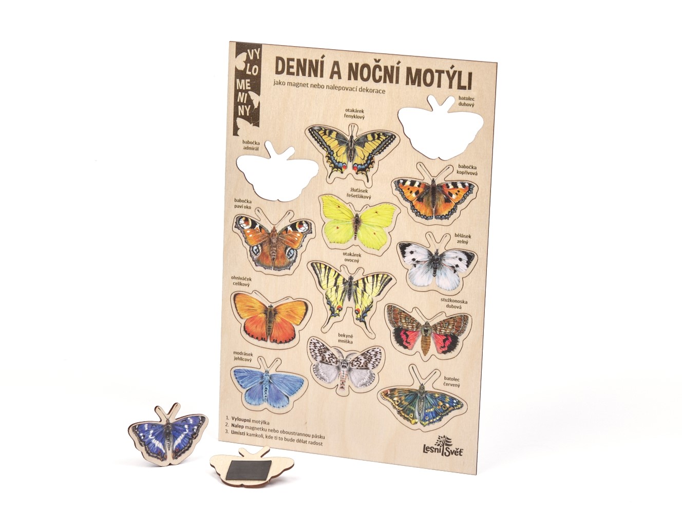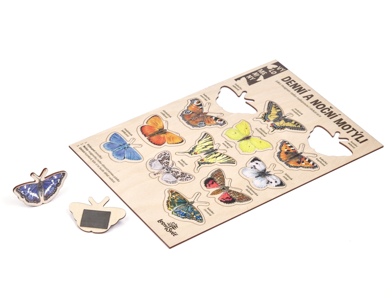Velké vylomeniny Noční a denní motýli jsou sada třinácti krásně ilustrovaných dřevěných figurek motýlů, jsou ideální hračkou pro rozvoj dětské kreativity a poznávání světa zvířat.