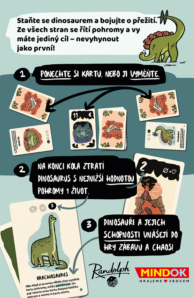 2. Vyměňujte karty pohrom, ve správnou chvíli využijte schopnost svého dinosaura a snažte se, ať životy dříve dojdou soupeřům!