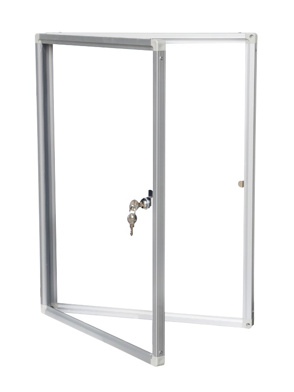 Interiérová vertikální vitrína ECO s robustním hliníkovým profilem UKF, plastovými rohovými spojkami. Vnitřní výplň magnetický lakovaný bílý plech . Polykarbonátové sklo. Uzamykatelná pomocí patentního klíče.