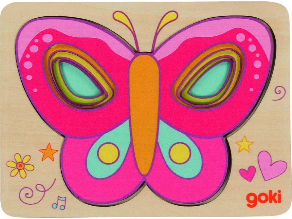 Objevte jemné kouzlo vrstveného dřevěného puzzle – ideální hračku pro malé objevitele od cca 2 let. Dítě – dychtivé po dobrodružství – najde pět vrstev „motýlích“ obrázků, které postupně odhaluje a skládá. Každá vrstva nabízí novou výzvu, podporuje hraní s různou úrovní obtížnosti a tím rozvíjí základní dovednosti přirozenou formou. Nabízí se několik variant hry.