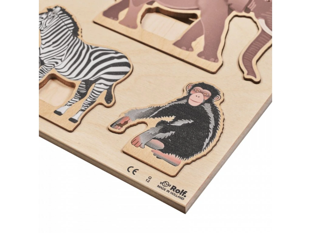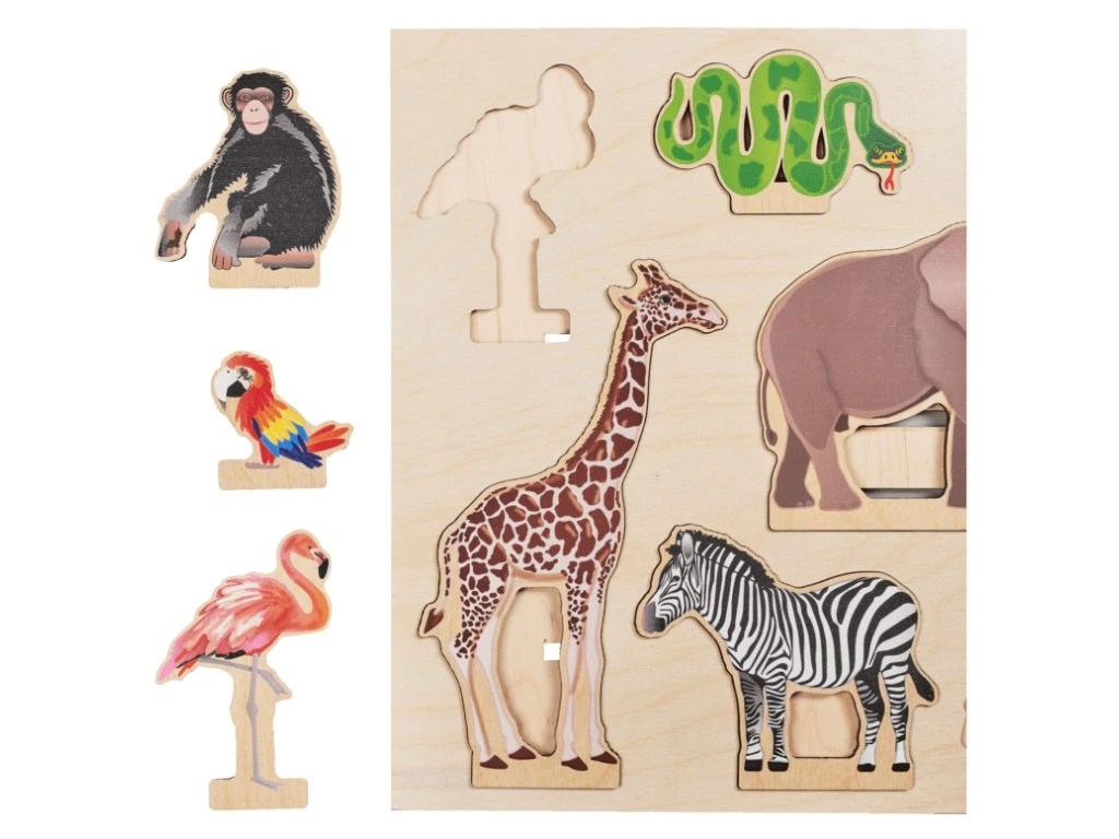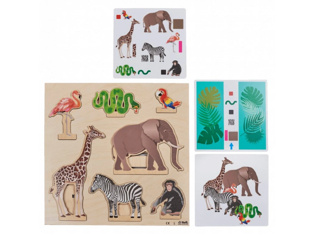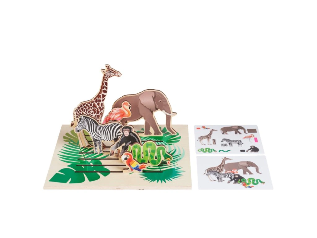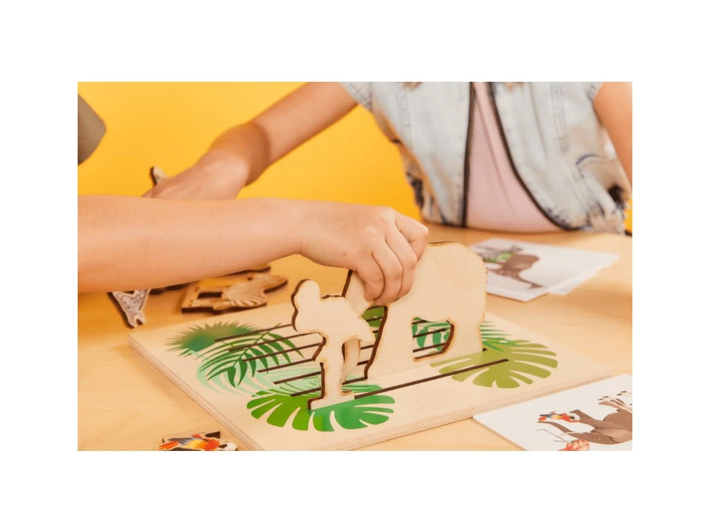 Souběžně děti objevují svět džungle a seznamují se s různými zvířaty, jako jsou šimpanz, slon, žirafa, zebra, plamenák, had a papoušek. Skládačka je vhodná pro jednotlivce, dvojice nebo týmy a může být hrána od raného věku, aby podpořila rozvoj jemné motoriky, prostorového myšlení a kreativity. vyrobeno z ekologického dřeva.