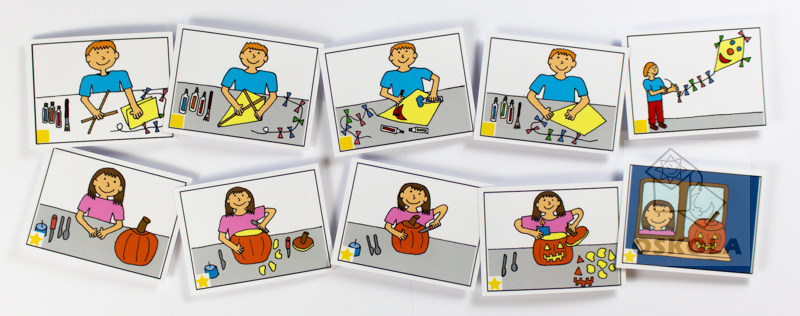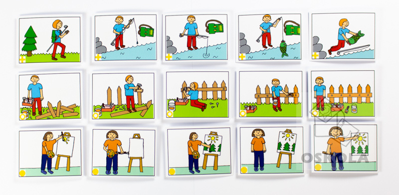 Sada obsahuje soubor osmi jednoduchých dějových posloupností, každá má pět karet.