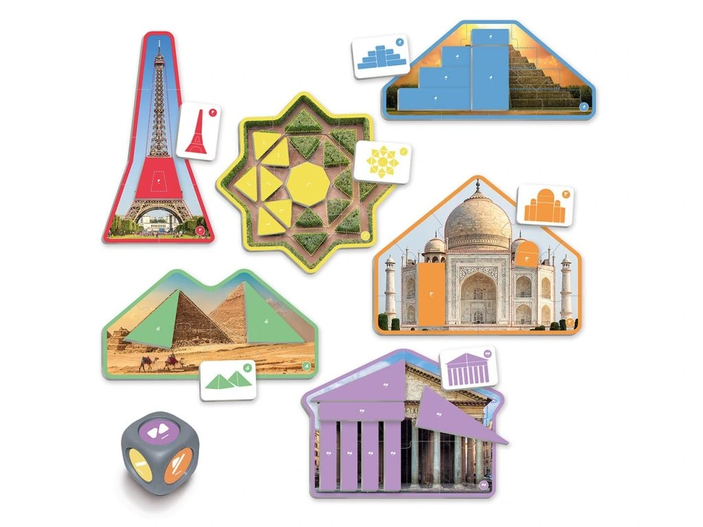 Objevte geometrické tvary v architektuře nejznámějších staveb světa! Soustředění a prostorová orientace umožňuje dětem objevovat a doplňovat skutečné obrázky významných staveb s různými geometrickými tvary.