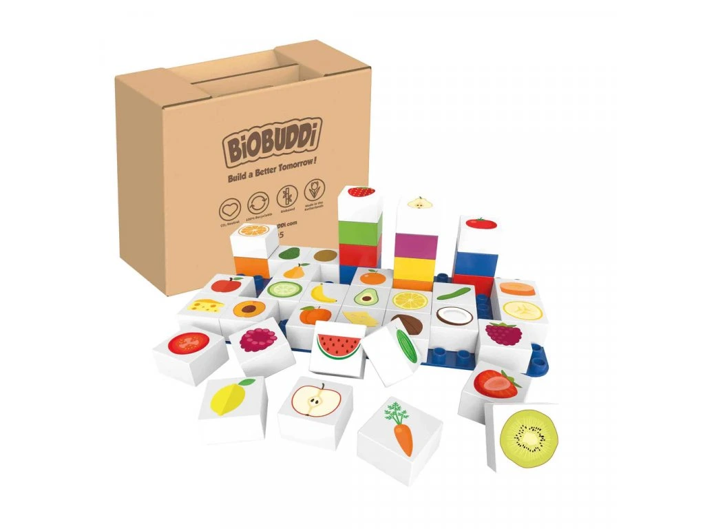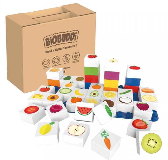 Vzdělávací kostičky BioBUDDi s druhy jídla přinášejí dětem zábavný a ekologický způsob, jak se seznámit s různými druhy zdravého jídla. Tato stavebnice: