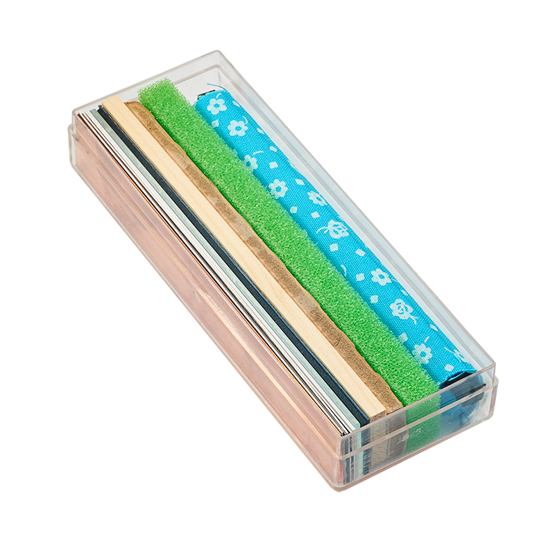 Sada Vzorky materiálů obsahuje: hliník, železo, sklo, guma, dřevo, porcelán, měď, nikl, karton, textilní látku, uhlí, molitan, zinek a plast. Sada je uložena v platovém boxu.