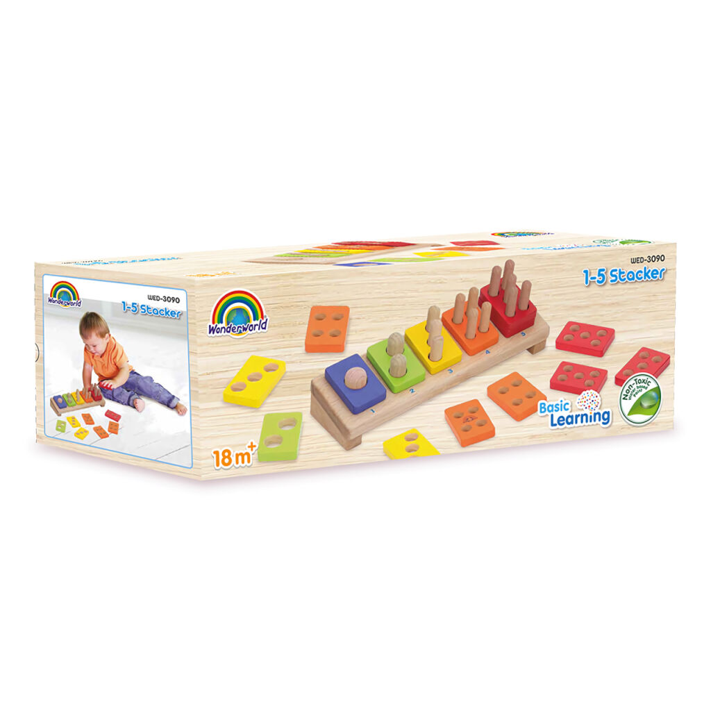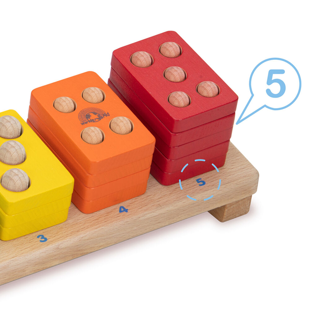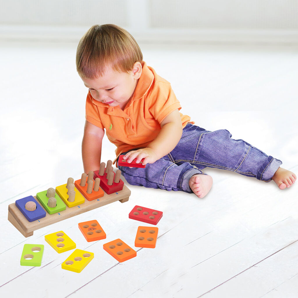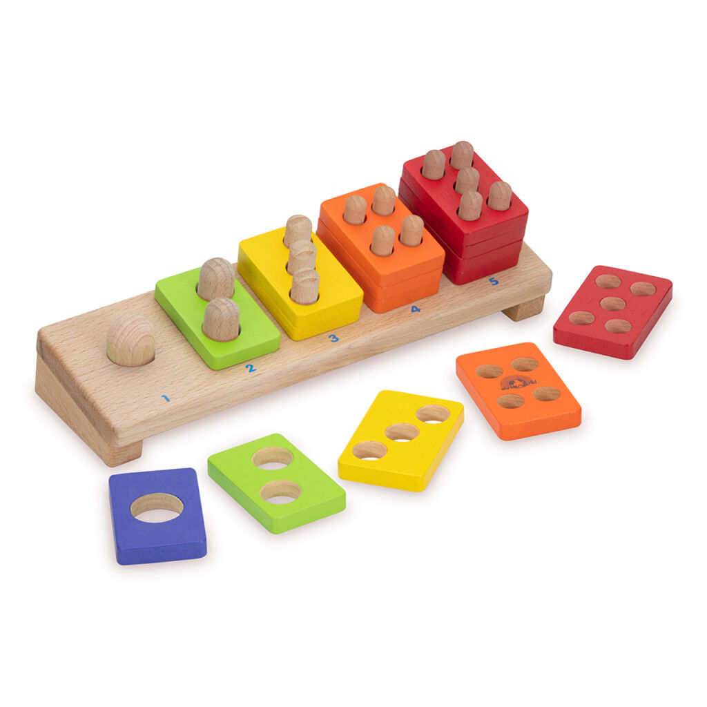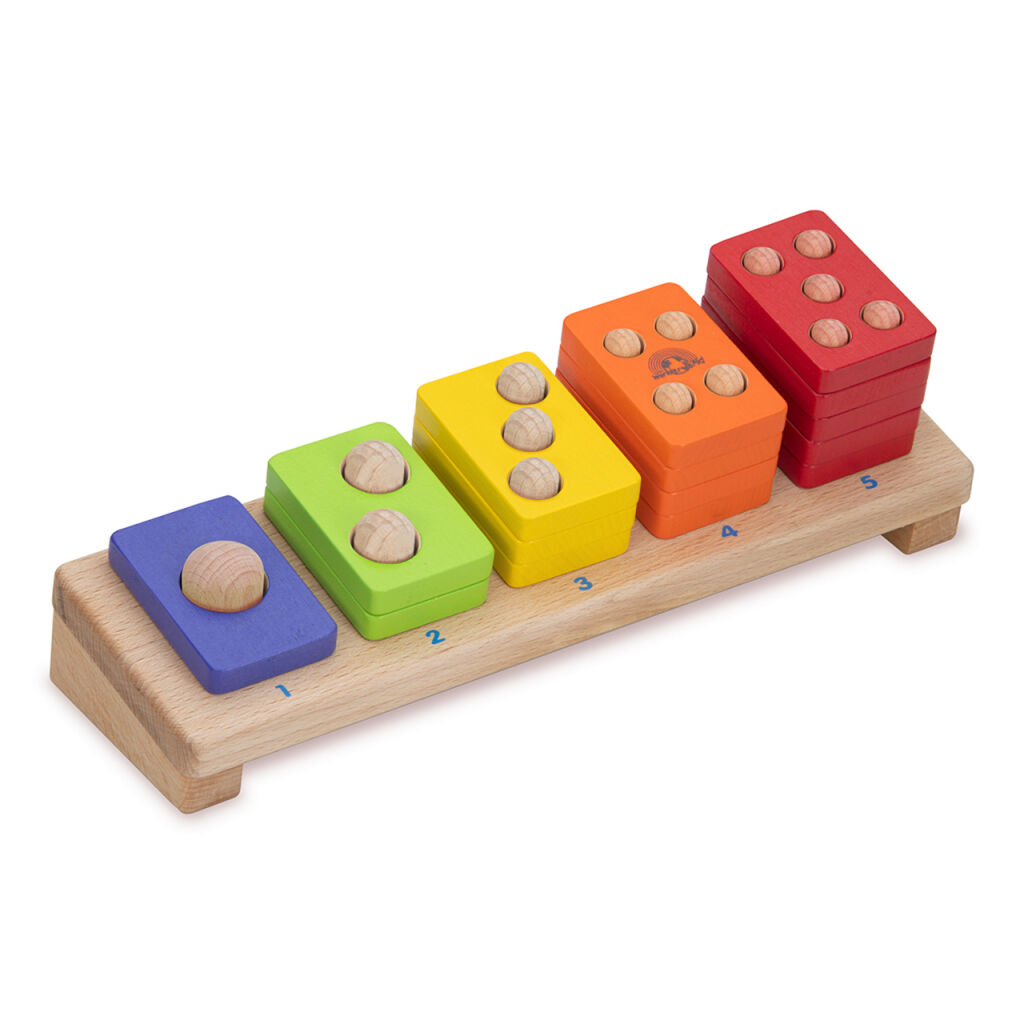 S přispěním výrazných barev pomůže tato jednoduchá skládačka dětem přirozeně pochopit význam čísel a naučit se základnímu počítání. Nasazováním destiček děti mohou navíc rozvíjet i jemnou motoriku. Hračka je robustní, vyrobená z odolného masivního dřeva.