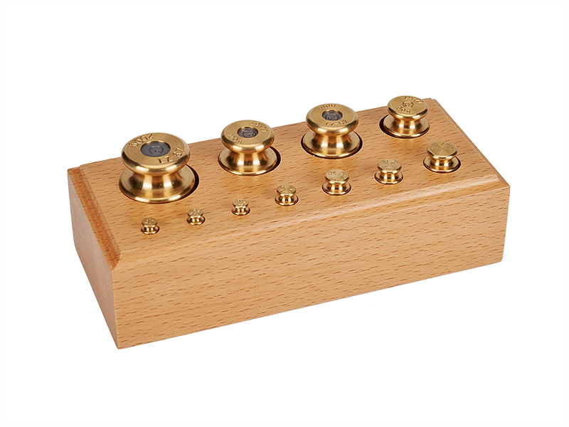 Žákovská sada 11 kusů závaží od 1 g do 200 g v dřevěném zásobníku.