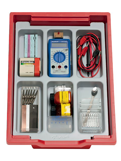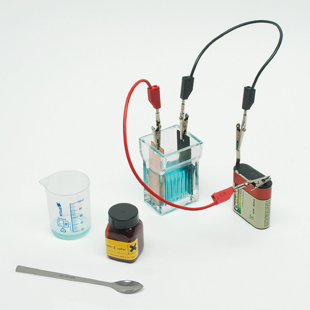 Žákovská souprava Elektrochemie obsahuje veškerý potřebný materiál k provádění základních experimentů.