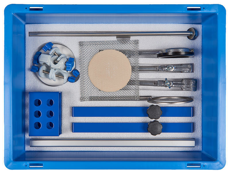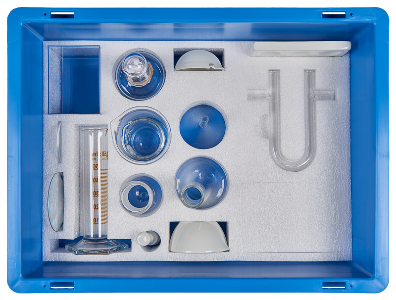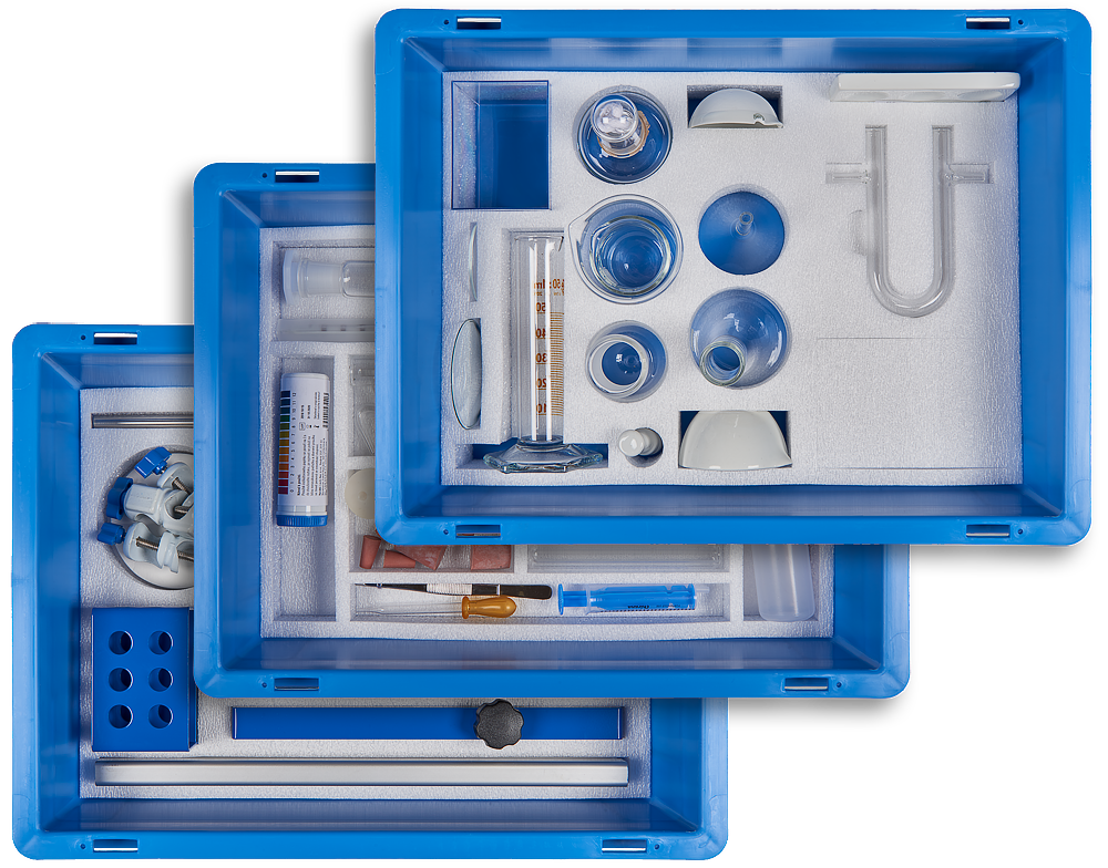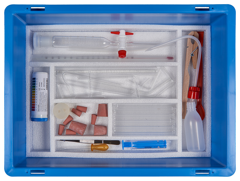 Obsah soupravy: kádinka 150 ml (1 ks), kádinka 50 ml (1 ks), dělící nálevka válcovitá 25 ml (1 ks), nálevka pr. 55 mm (1 ks), baňka Erlenmayerova 100 ml (1 ks), válec odměrný 50 ml (1 ks), zkumavka 12×100 (10 ks), destička porcelánová 6 jamek (1 ks), indikátorové papírky (1 ks), filtrační papíry pr. 90 mm (100 ks), lžička laboratorní (1 ks), injekční stříkačka 10 ml (1 ks), kapátko (1 ks), pinzeta (1 ks), kahan lihový 50 ml (1 ks), střička PE kompletní 50 ml (1 ks), držák na zkumavky (1 ks), U-trubice se dvěmi bočními trubicemi pr. 12 mm, olivka 6 mm, výška 120 mm (1 ks), skleněná tyčinka 5 mm/20 cm (1 ks), sklo hodinové pr. 50 mm ((1 ks), sklo hodinové pr. 70 mm (1 ks), síťka s keramickým středem 125×125 mm (1 ks), teploměr -10 až 150 °C org. (1 ks), třecí miska drsná 30 ml (1 ks), baňka 50 ml, NZ 29/32 (1 ks), destilační trubička (1 ks), trubička na jímání plynu (1 ks), trubička L 5×120 mm (1 ks), trubička L 5×5 mm (1 ks), trubička 60° 5×120 mm (1 ks), trubička 120° 5×120 mm (1 ks), trubička rovná 75 mm (1 ks), trubička rovná 150 mm (1 ks), trubička rovná 300 mm (1 ks), rourka skleněná 18×200 mm (1 ks), trubička T (1 ks), hadice silikonová cca 200 mm (1 ks), kartáč na zkumavky pr.12 silon (1 ks), porcelánová miska 36 ml (1 ks), gumové a silikonové zátky, stojánek na 6 zkumavek – povrchová úprava modrý komaxit (1 ks), svorka křížová dvojitá (3 ks), kruh na filtraci pr. 40 mm (1 ks), kruh varný bez svorky pr. 70 mm (1 ks), držák laboratorní TYP I (1 ks), držák laboratorní TYP II (1 ks), stojan (1 ks). Stojan se skládá z: hliníková noha – povrchová úprava modrý komaxit (2 ks), hliníková kolejnice – povrchová úprava šedé eloxování (1 ks), nerezové stativové tyče (2 ks)