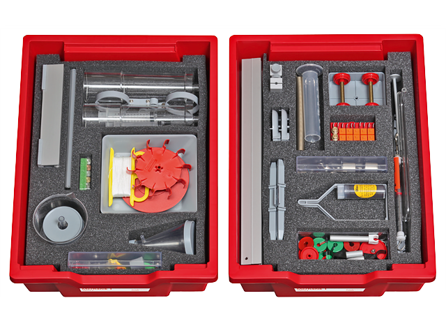 Souprava SEG Mechanika 1 obsahuje veškerý potřebný materiál k experimentálnímu ověření základních zákonitostí kapalin, pevných látek a plynů