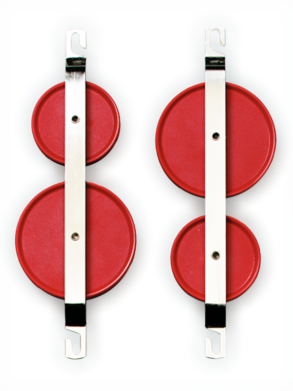 Kladky jsou vyrobené z plastu s drážkami na lanka, závěsy jsou z poniklovaného kovu a mají dva háčky.