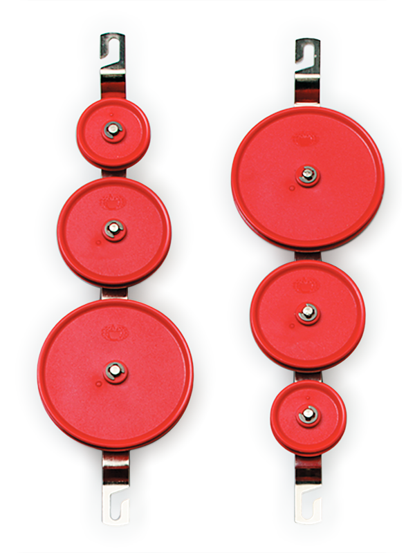Kladky jsou vyrobené z plastu s drážkami na lanka, závěsy jsou z poniklovaného kovu a mají dva háčky.