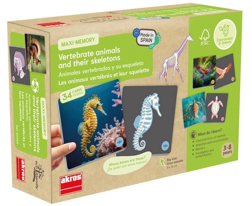 Objevte obratlovce a jejich kostry prostřednictvím pexesa s velkými kartami obsahujícími skutečné obrázky. Umožňuje dětem trénovat paměť, pracovat na pozornosti a dozvědět se více o obratlovcích ve světě zvířat: savcích, plazech, rybách, ptácích a obojživelnících.