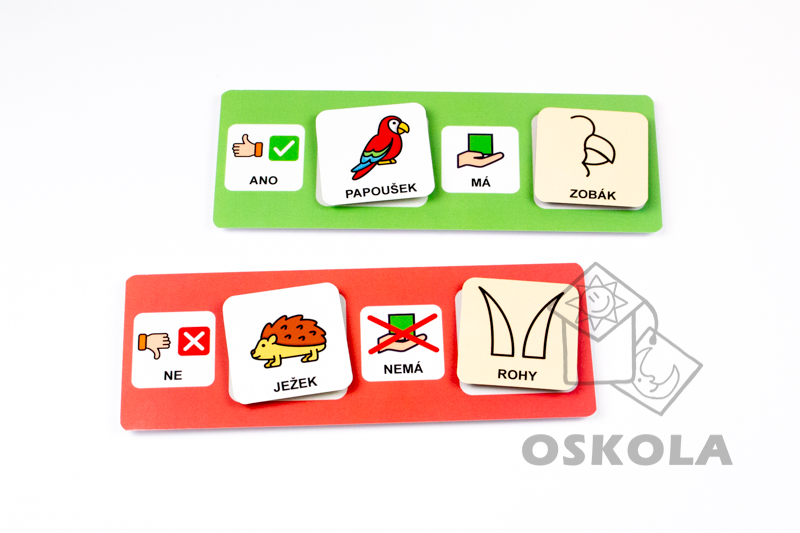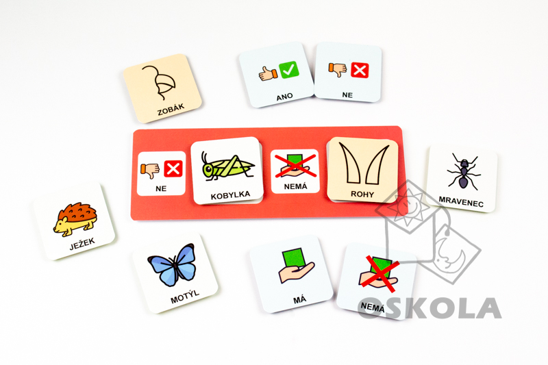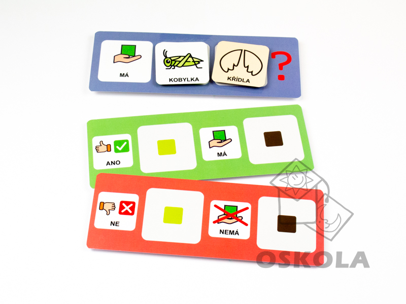 Navíc jsou součástí menší kartičky určené ke skladbě vět – dítě si je řadí do větného schématu jako vizuální oporu a odpovídá celou větou.